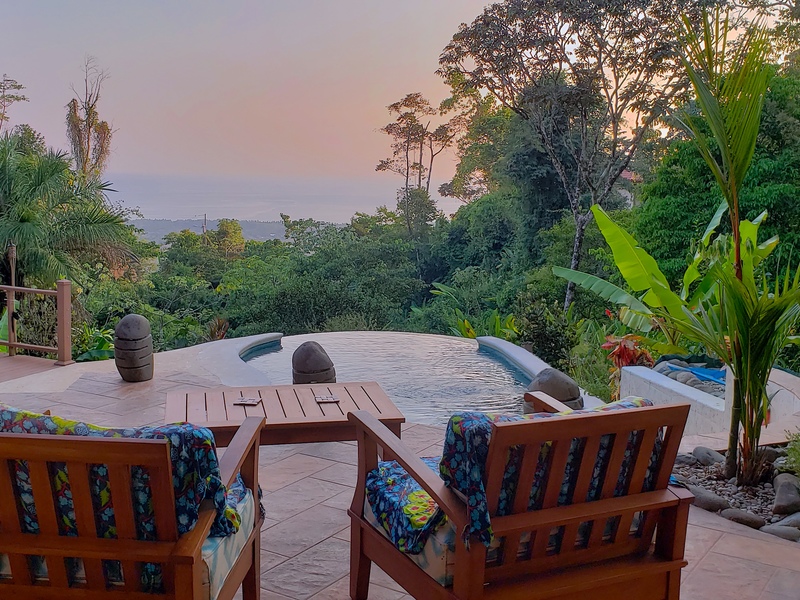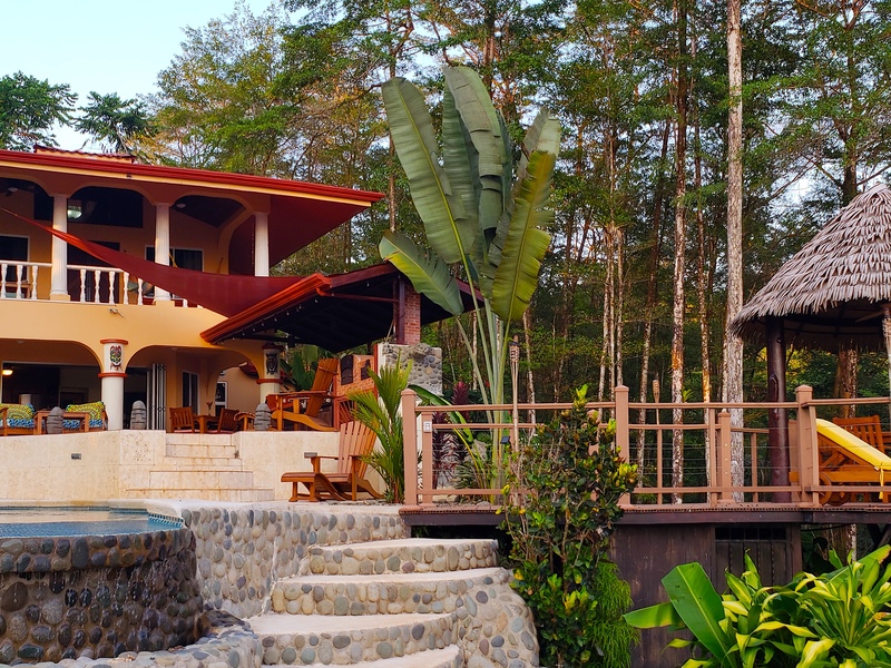 This tropical property is located in Uvita, where the whale\'s tail is and the National park Marino Ballena. The property consist in 2 homes that are located far enough in order to give the privacy you are looking for. The main home offers a 2 bedrooms in the ground floor, open concept terrace and kitchen/living area and 1 huge master bedroom on the top floor with private balcony looking out the whales tail. Outside is where you can sit all day long, under roof or open by the pool, the patio around it is amazing and big. There is a small look out with dinning table and chairs so you can enjoy the Toucans and Monkeys.