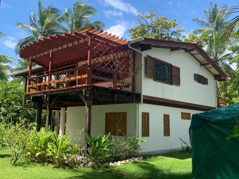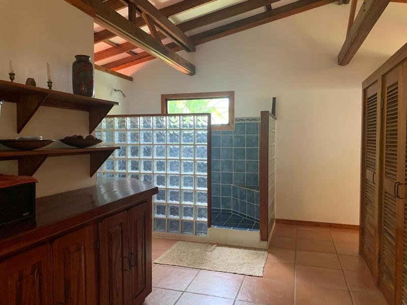 The upstairs is the main living quarters featuring the living room, a large kitchen, air-conditioned office, master bedroom with a king-size bed, a spacious bathroom with large shower and plenty of closets. It has 3 verandas to enjoy garden view or ocean, beautiful sunsets, and stargazing; one veranda is covered and there are two new (2018) teak wood verandas.