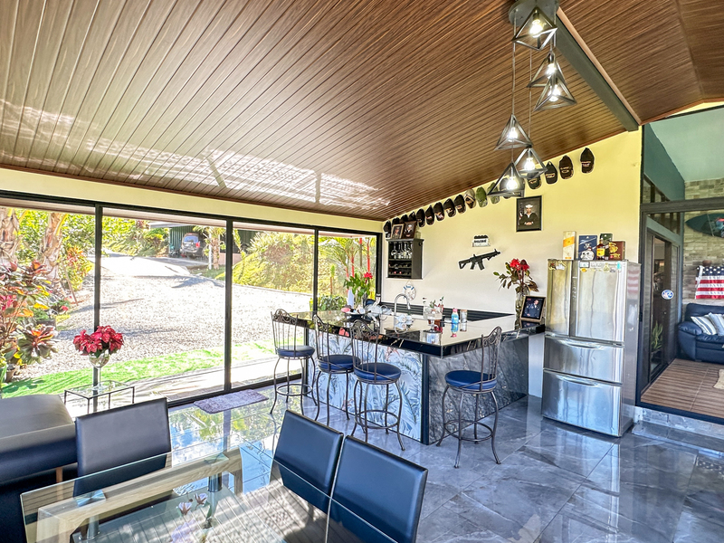 Natural beauty surrounds the home, and large windows throughout draw in the sweeping views of mountains and jungle. The upper-level balcony is a highlight, complete with a built-in bar—perfect for sipping a glass of wine while taking in the serene ambiance. An additional covered deck provides an excellent space for entertaining, grilling, or simply relaxing in the cool mountain air. A small carport and a separate bodega add thoughtful practicality.