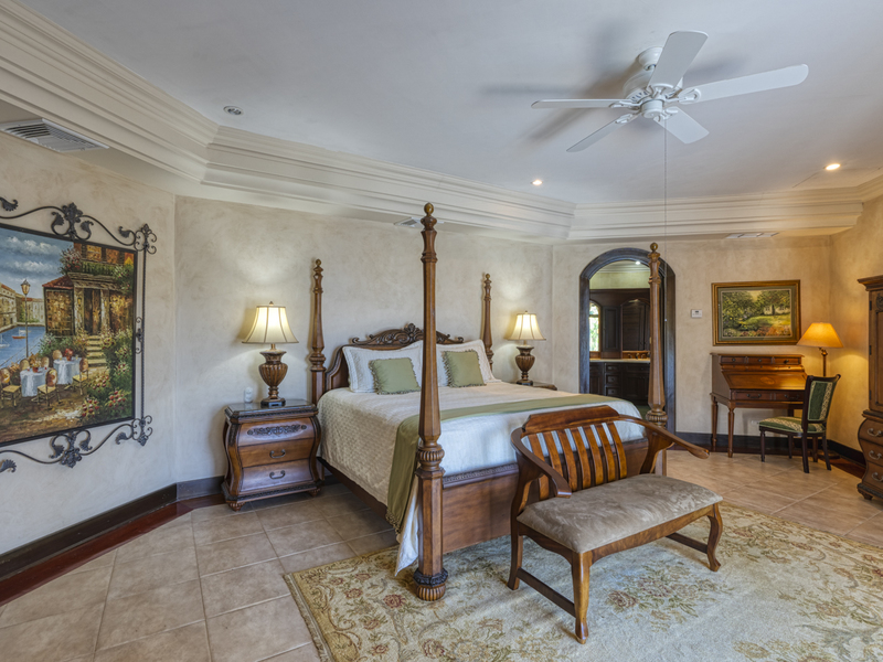 A mosaic-tiled walkway and a flowing water fountain greet visitors on arrival. Upon entering Casa Eleganza you’ll walk through a foyer decorated with antique-style wrought iron chandeliers, arched ceilings and doorways, ceramic tiling and exotic local wood sourced to complete the beautiful side paneling.