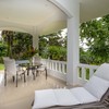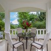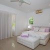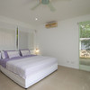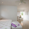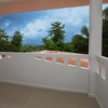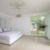Upstairs is the master bedroom featuring two balconies, one on either side for a variety of views, and a full bath with double sinks, a bidet, and a continuation of the soft clay-colored porcelanto tiles throughout.