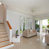 Upon entering the principal residence, one is impressed with the light and airy look and feel owing to the clean whites, windows on every wall, and warm clay-colored porcelanato floor tiles. The inviting layout of the main floor draws the eye effortlessly with a seating area leading through sliding glass doors to a lovely porch on the right, a central staircase, and the dining area leading to the kitchen on the left. The main floor also has one bedroom with a full bath as well as a half bath for visitors.