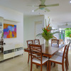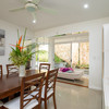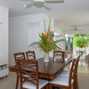 The kitchen includes high-quality appliances, a breakfast bar on a peninsula, and space for a café table. Cleverly placed mirrors are used to brilliant effect to open up the feel of the kitchen and bring more of the outside in. Sliding glass doors lead out to the paved area surrounding the house and offer a view of the gorgeous ginger-colored stone retaining wall separating this property from the neighbors. Adjacent to the kitchen is the laundry room with a door to the large carport thus giving direct access from the outside so it could serve as a ‘mudroom’ of sorts.