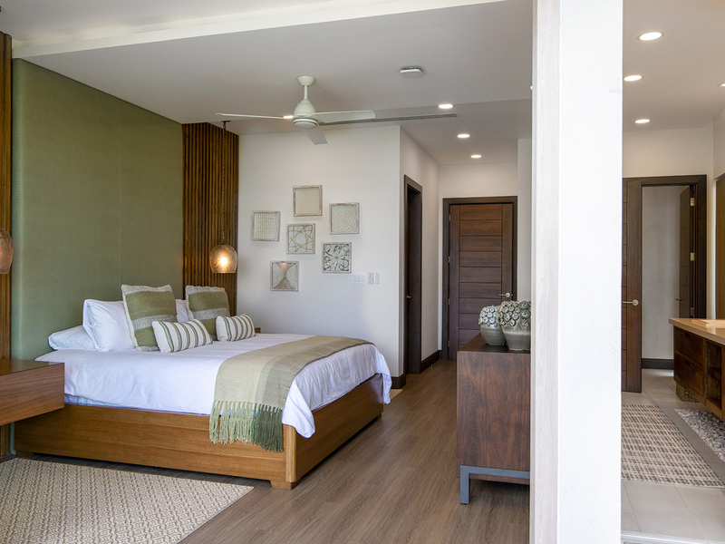 Retreat to the master bedroom sanctuary, complete with a private balcony overlooking the ocean. Luxurious en-suite bathrooms feature double sinks and outdoor rain showers, complemented by standalone stone tubs.