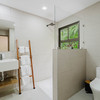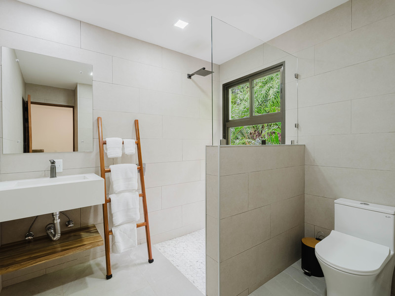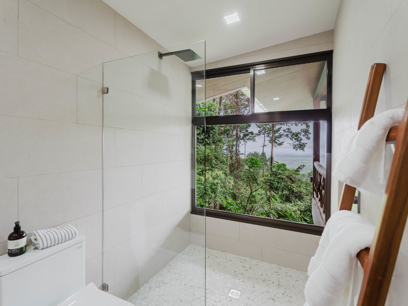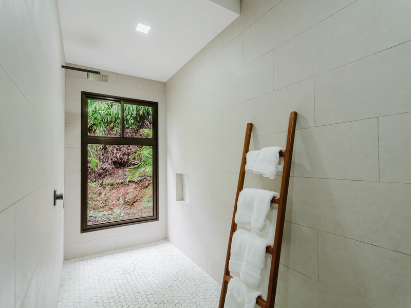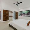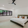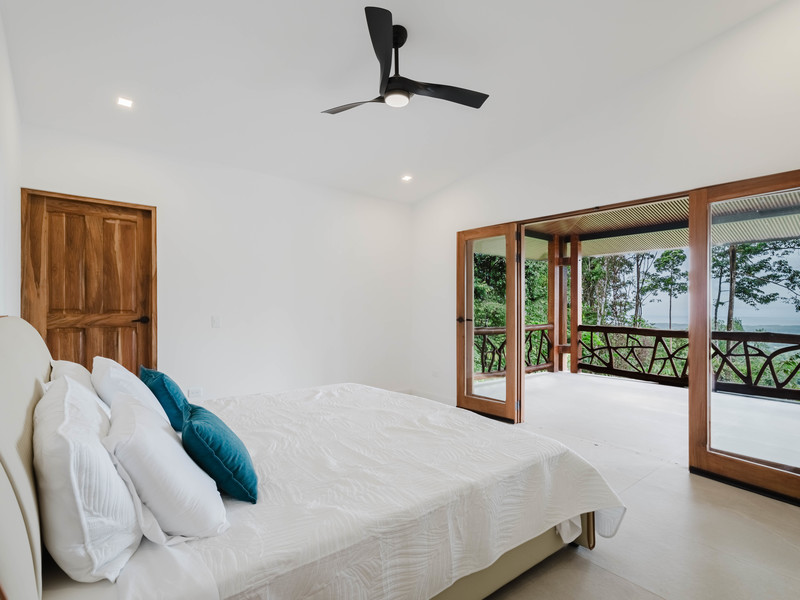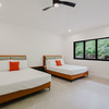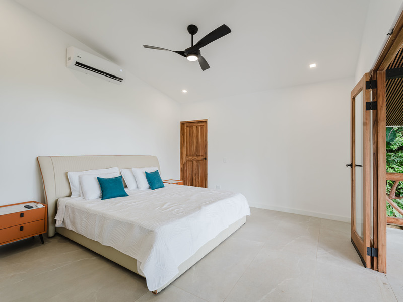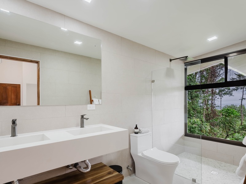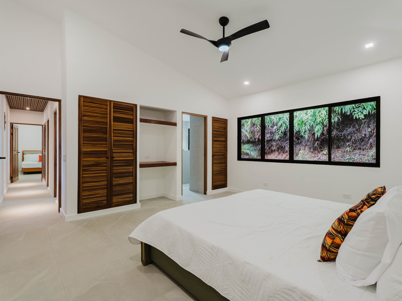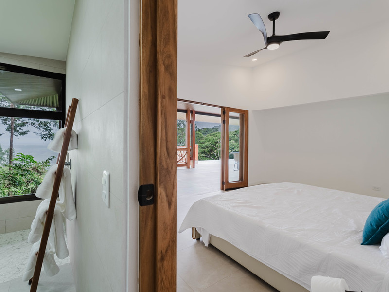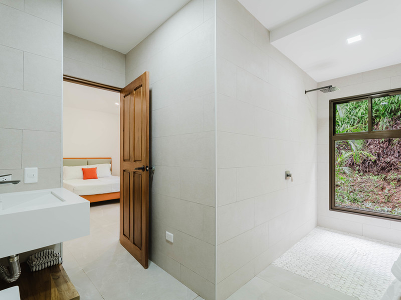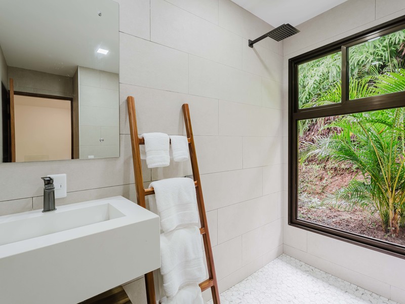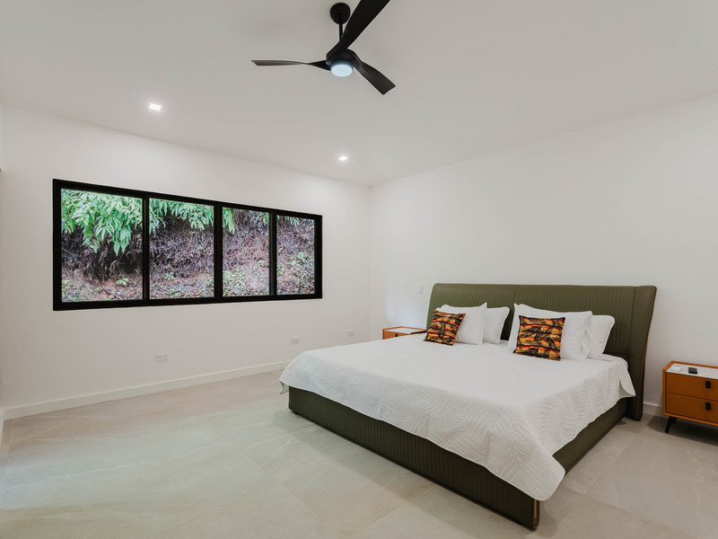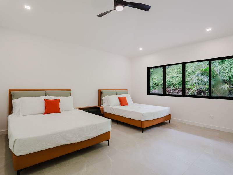 The Master bedroom sits on the front side of the villa with a king size designer bed set and opens out to the large balcony with ocean views and has its own ensuite bathroom with built in dual vanity courtz sinks and countertops with a rain shower that overlooks the ocean and jungle landscape. The additional two bedrooms reside on the back of the villa with jungle views. One of the bedrooms features a king size bed with an ensuite bathroom servings as a secondary Master Bedroom, while the third bedroom features two queen size bed and a dual-access ensuite bathroom.