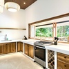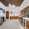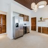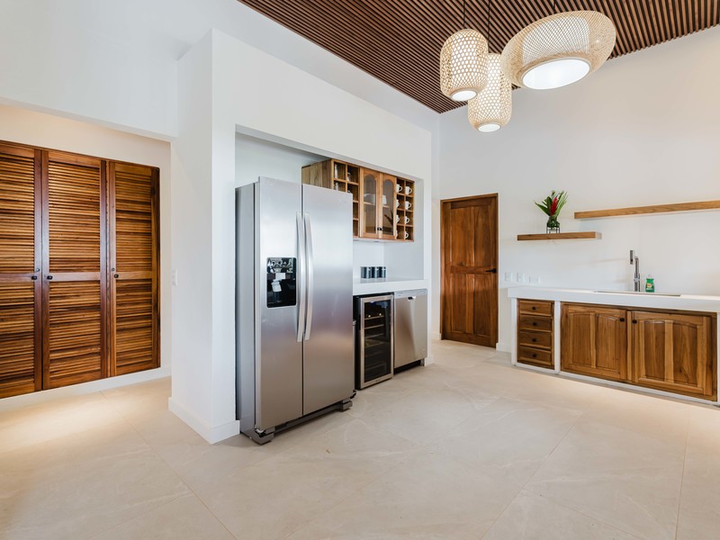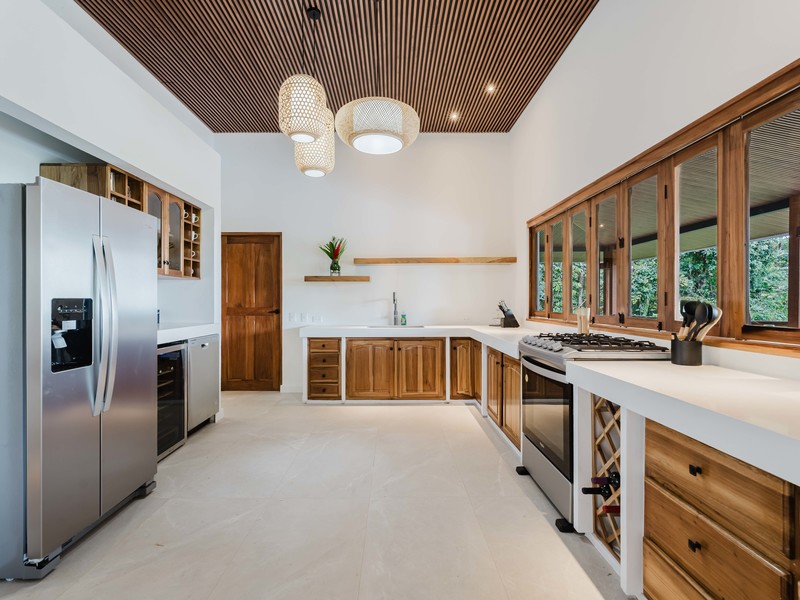 Step into this stunning kitchen that exudes elegance and functionality, featuring soaring high ceilings that create an open and inviting atmosphere. The rich teak cabinetry adds warmth and sophistication, beautifully complementing the sleek quartz countertops that provide ample space for meal prep and gatherings. Fully equipped with stainless steel appliances, including a refrigerator with ice maker, gas stove, dishwasher, along with a wine/beverage fridge ensures that your favorite vintages are always within reach, perfect for entertaining guests. The kitchen layout is designed with socializing in mind, highlighted by accordion windows that seamlessly open up to the outdoor bar and the formal outdoor dinning area. This feature invites