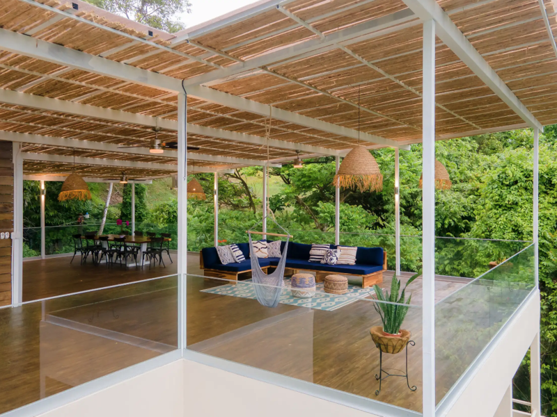 The villa features 9 bedrooms and 11 bathrooms spread over four stories, offering a perfect balance of luxury and nature. Divided into three sections, it can cater to families or groups of friends of varying sizes. The main entrance opens into a spacious, open-plan area with a gourmet kitchen equipped with high-end appliances, including a coffee maker, espresso machine, flat top grill, industrial 4-burner stove, microwave, toaster, and blender. A cozy breakfast counter made of washed concrete leads to a tropical hardwood dining area, living room, and a large covered deck—ideal for enjoying Costa Rica’s finest coffee.
