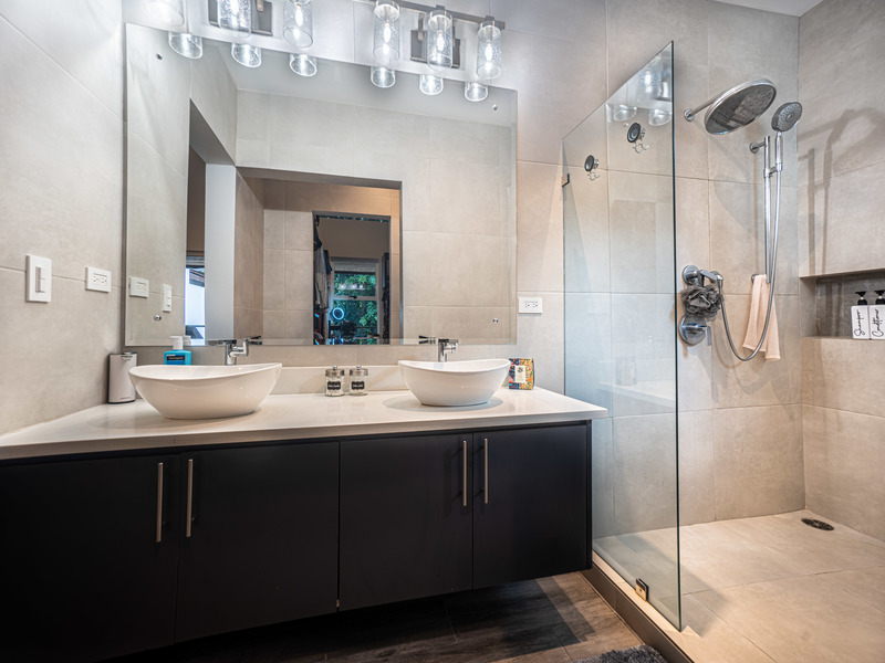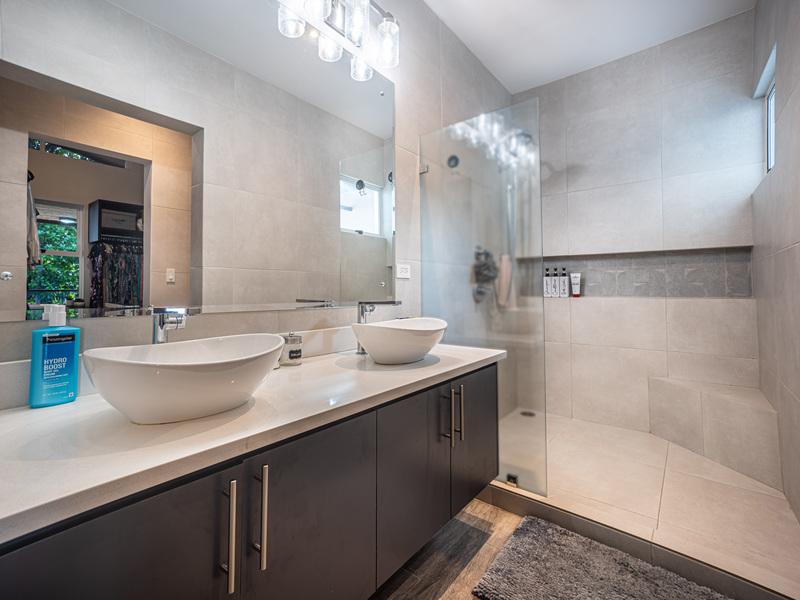The master suite is a true retreat featuring a luxurious en-suite bathroom with custom tiled showers, dual vanities, and a spacious walk-in closet with a dedicated vanity area. A private outdoor balcony completes this serene space.
