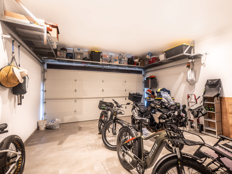The hip-roof garage is both functional and stylish, offering space for two vehicles and equipped with custom welded storage units and a practical mudroom for swimwear or rain gear.