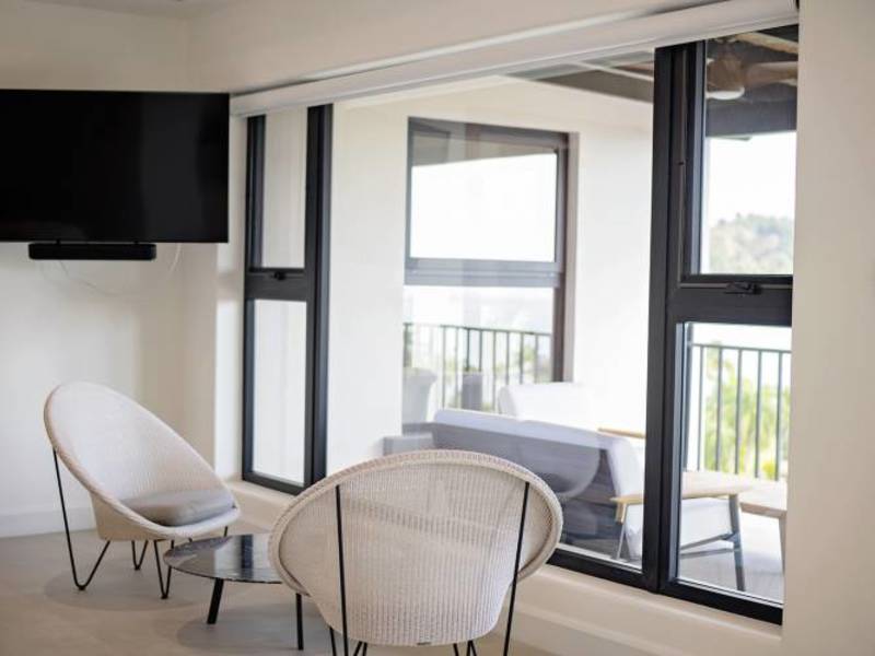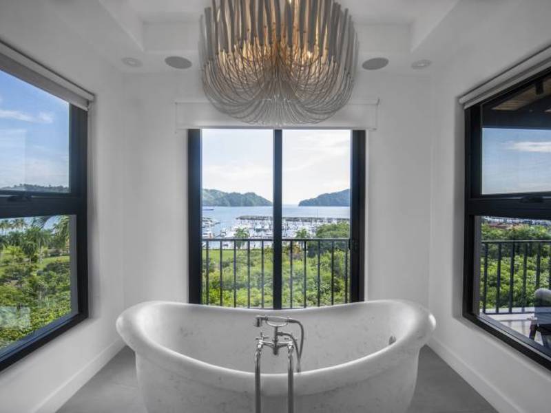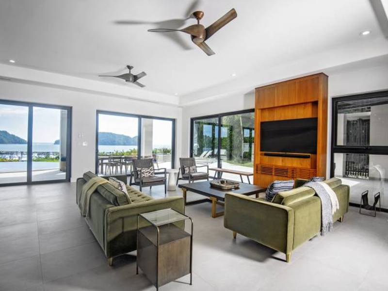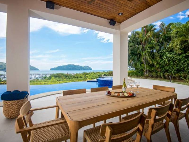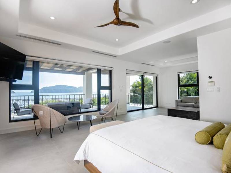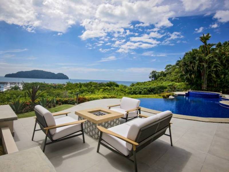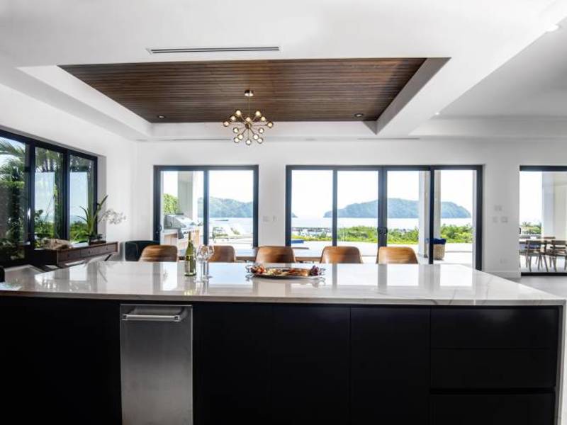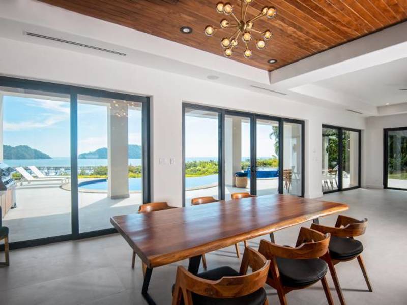 Expansive floor-to-ceiling windows and sliding doors provide unobstructed views of Herradura Bay and the villa\'s lush tropical landscape, offering a serene backdrop to every room.