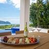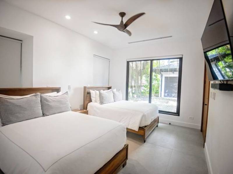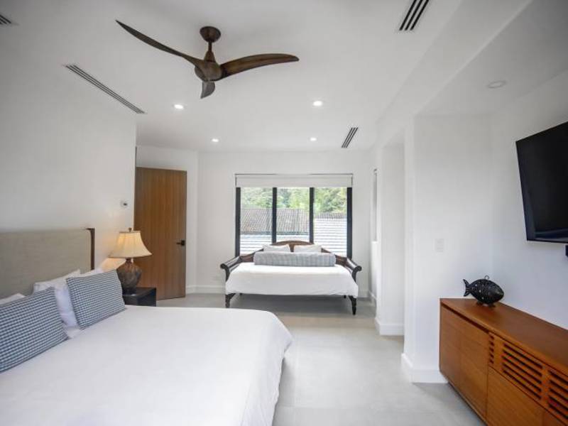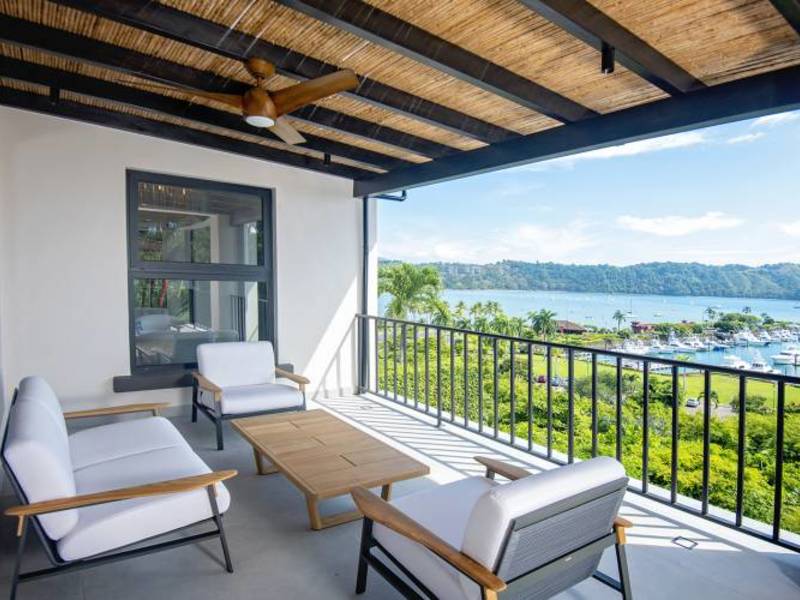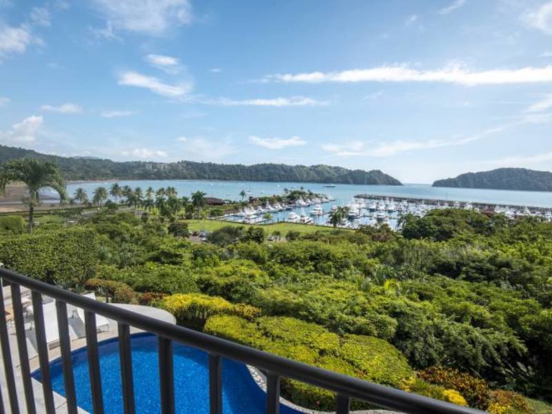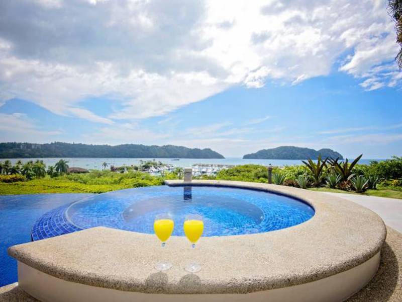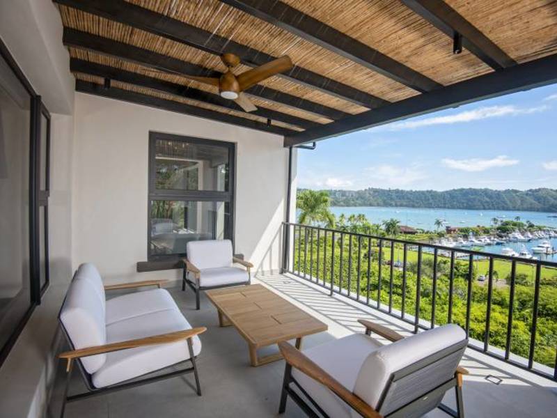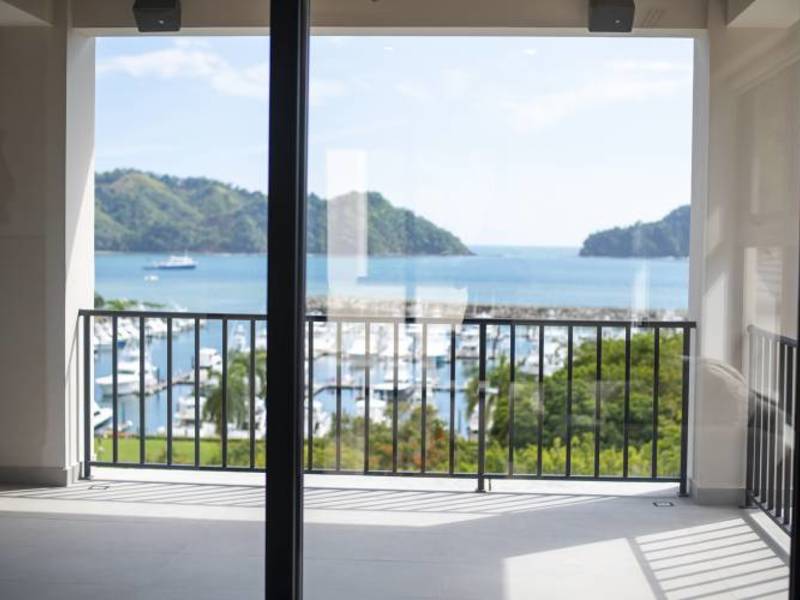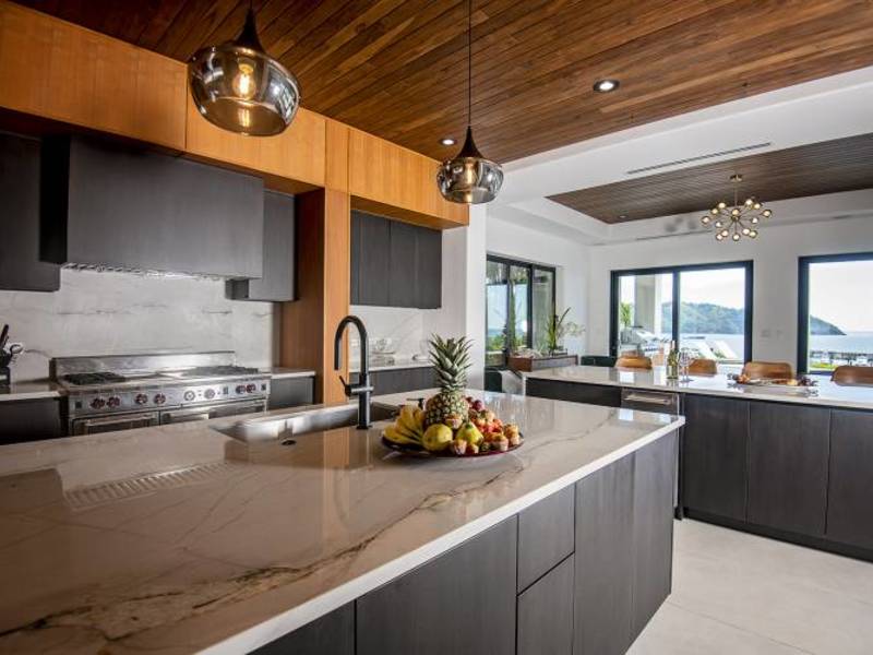 Expansive floor-to-ceiling windows and sliding doors provide unobstructed views of Herradura Bay and the villa\'s lush tropical landscape, offering a serene backdrop to every room.