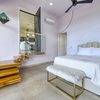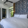 The primary suite is a private sanctuary with direct access to the pool deck, a spa-inspired bathroom with soaking tub, ambient LED lighting, dual vanities with natural stone counters, and a generous walk-in closet. A secondary suite on the opposite wing boasts sweeping coastal views, teak stair access, built-in closets, and a luxurious ensuite. The third bedroom, connected by an internal hallway, opens to the wraparound deck and shares a full bath with the main living area.