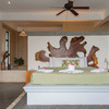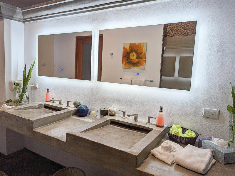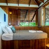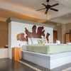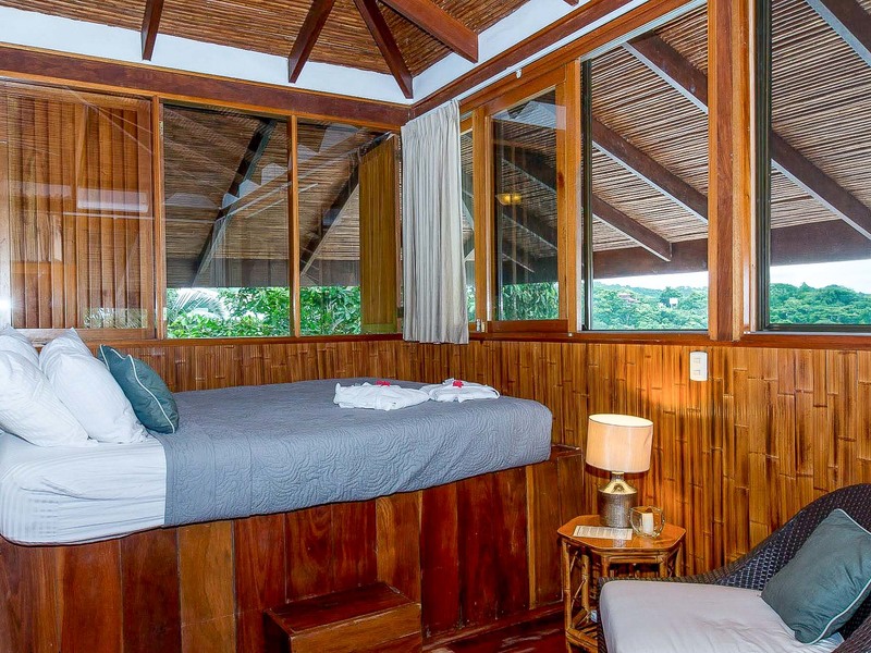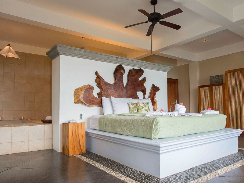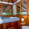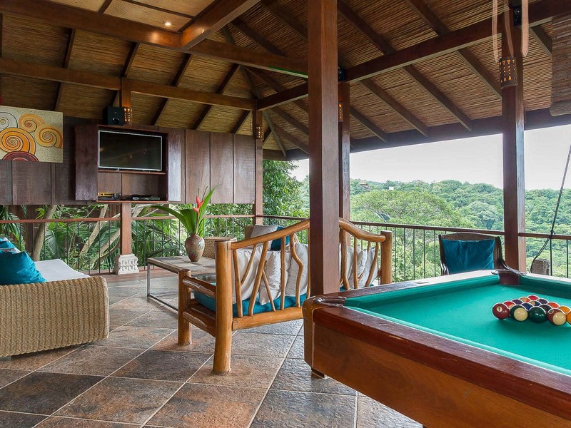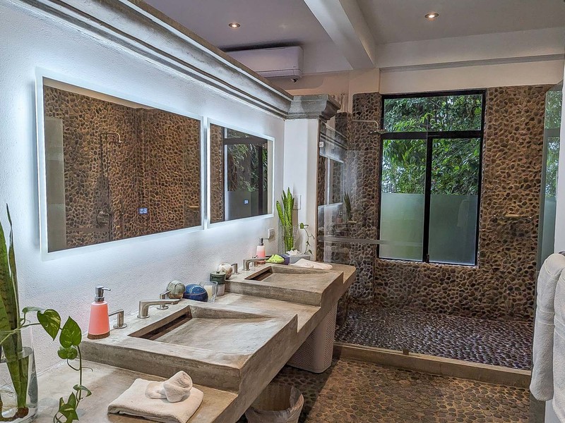 One level up, the master suite awaits — a private retreat with a king bed, luxurious bathroom, handcrafted ceramic sinks, and a private Jacuzzi tub. Higher still, the villa features an open-air living and game room suspended in the jungle canopy, creating one of the most unique gathering spaces in Manuel Antonio. Additional guest suites, including the “Nest Suite” at the top of the home, provide cozy escapes ideal for children, teens, or couples seeking privacy.