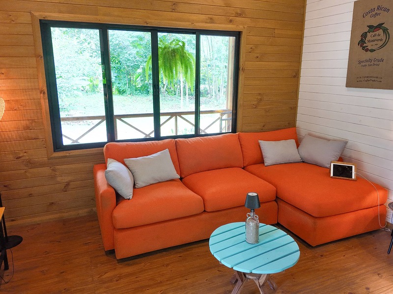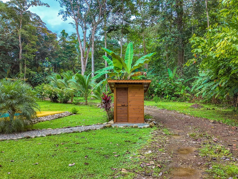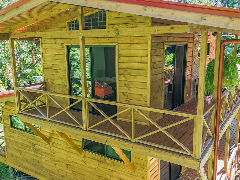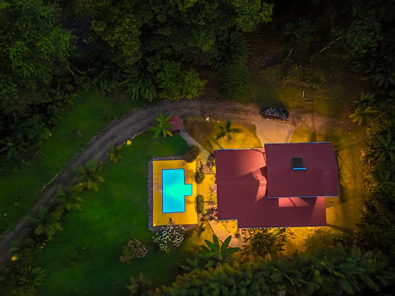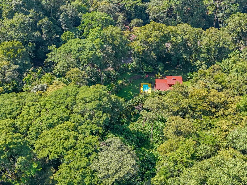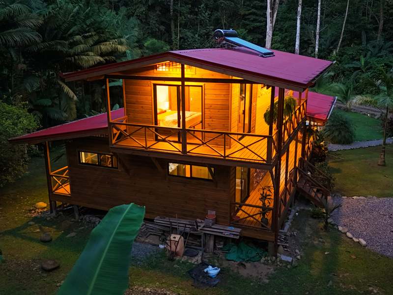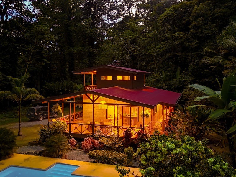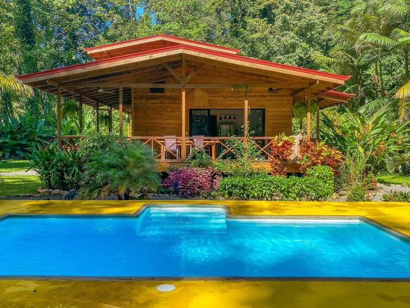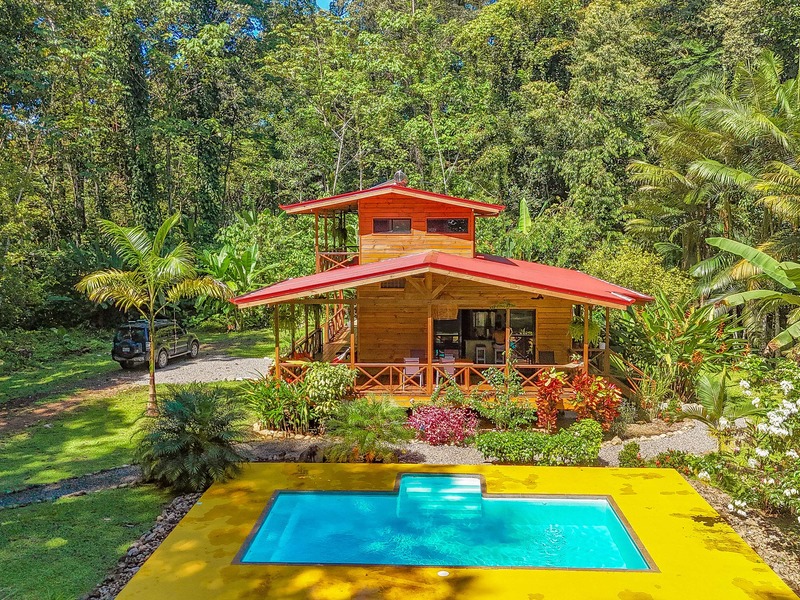 This 2-level, 3-bedroom home fits PERFECTLY into its rainforest surroundings. Beautiful & warm lumber graces both the exterior and interior of the home & tastefully contrasts with the blue pool, sunny yellow pool-deck and the bright red roof of the home. Areas of external stone cladding anchor the home and compliment the riverstone banks of the nearby Rio Media Luna which borders the property.