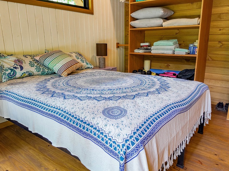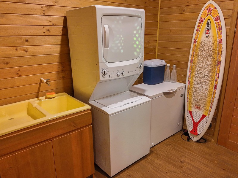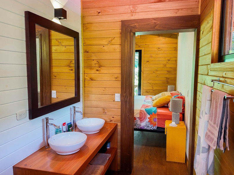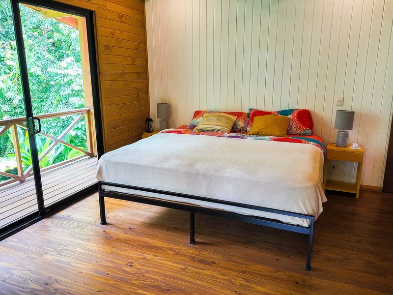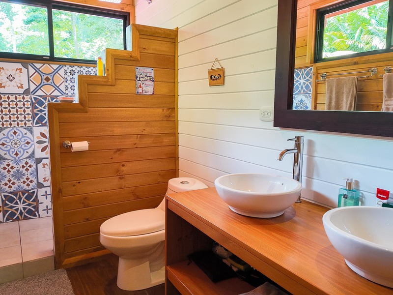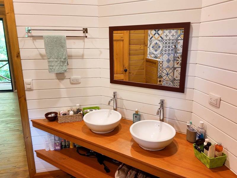 Two lower bedrooms, big and well-served with accessories and storage areas, offer sliding-door access to the covered outside verandah & patio area. A shared bathroom and shower is finished with plentiful Spanish tiles, white accents, and the same warm lumber that permeates the home. A separate laundry area holds plenty of storage space. Upstairs, the Master Bedroom with ensuite & wrap-around verandah occupy the entire floor – perfect privacy with stunning rainforest views.