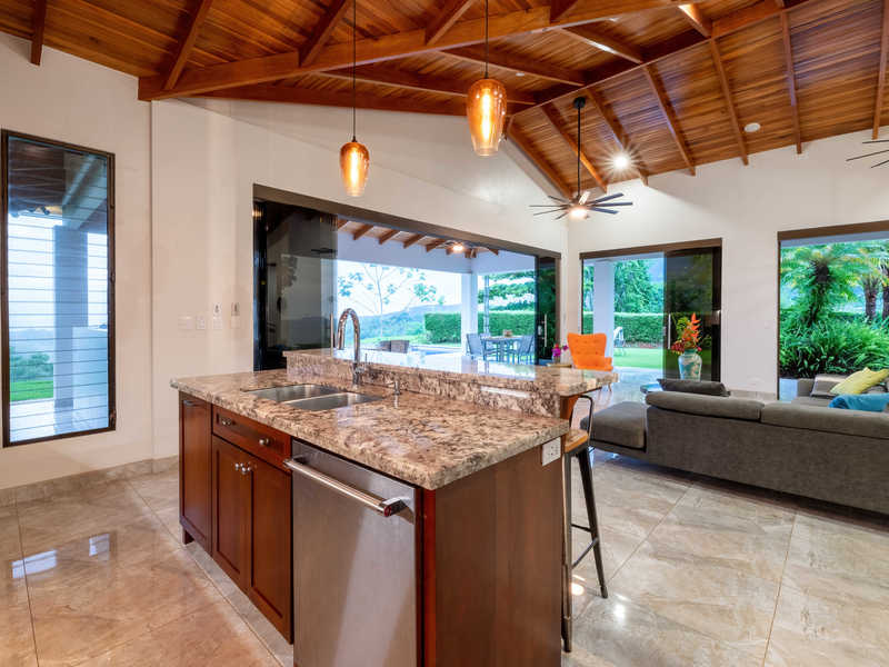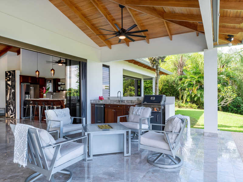 Designed to harmonize modern elegance with tropical allure, the home features soaring vaulted ceilings, a gourmet kitchen equipped for culinary artistry, and a seamless indoor-outdoor flow. Step outside to discover an entertainer’s paradise: fire up the built-in BBQ on the ample covered patio, dine alfresco under ambient lighting, or take a dip in the sparkling oversized pool framed by lush greenery. The expansive grassy lawn invites endless possibilities—let children play freely, host spirited volleyball matches, or set up a cricket pitch for friendly competitions.