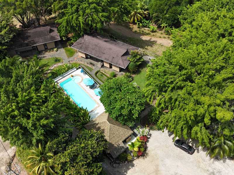 Zone 2 (2.6 acres): Existing villas, pool, and caretaker home with 5 additional prepped building sites, ideal for new villas or a restaurant.