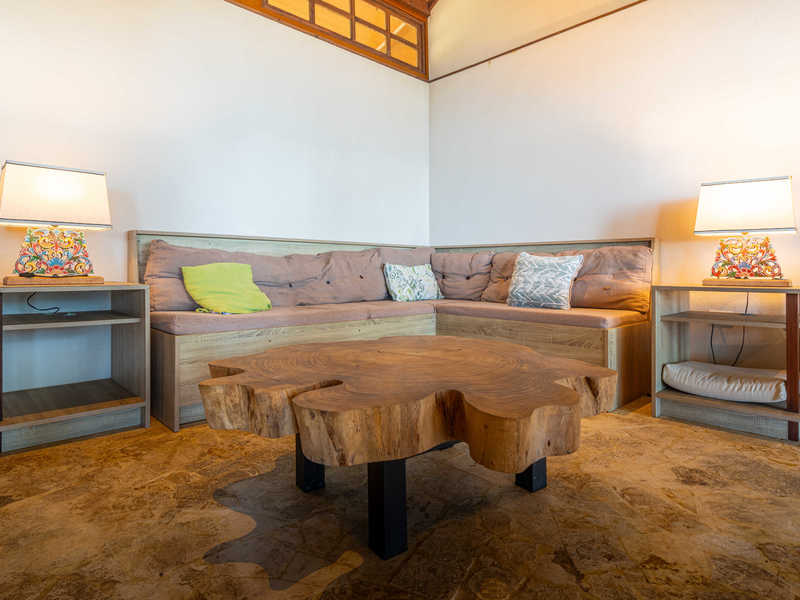Spacious great room with vaulted ceilings and ocean-view kitchen