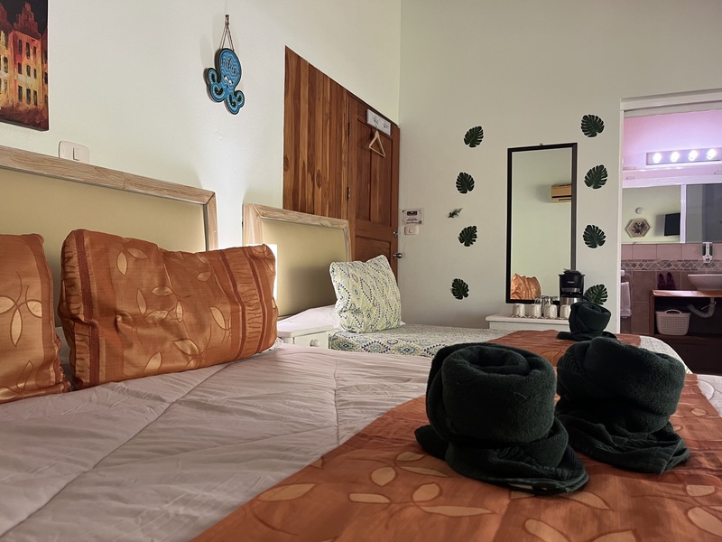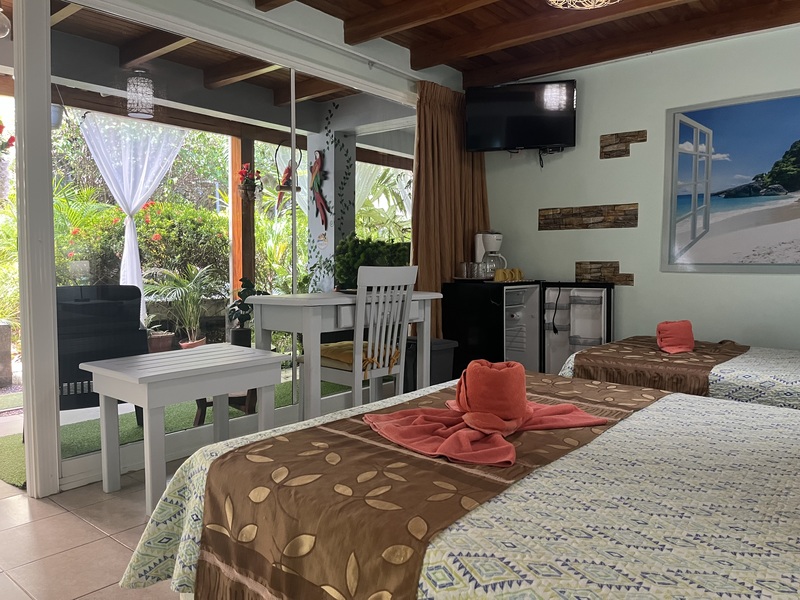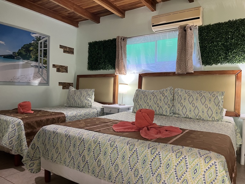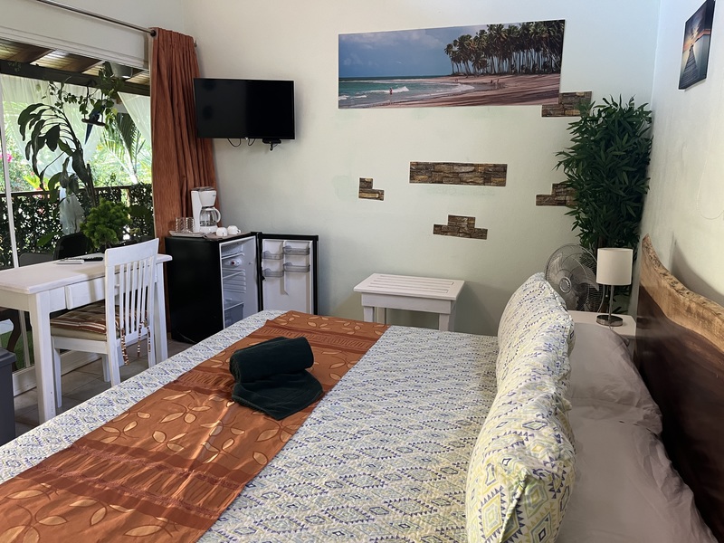 All rooms are equipped with: air conditioning, ceiling fan, mini fridge, TV, coffee maker, hot water, and complete bathroom amenities including towels and toiletries.