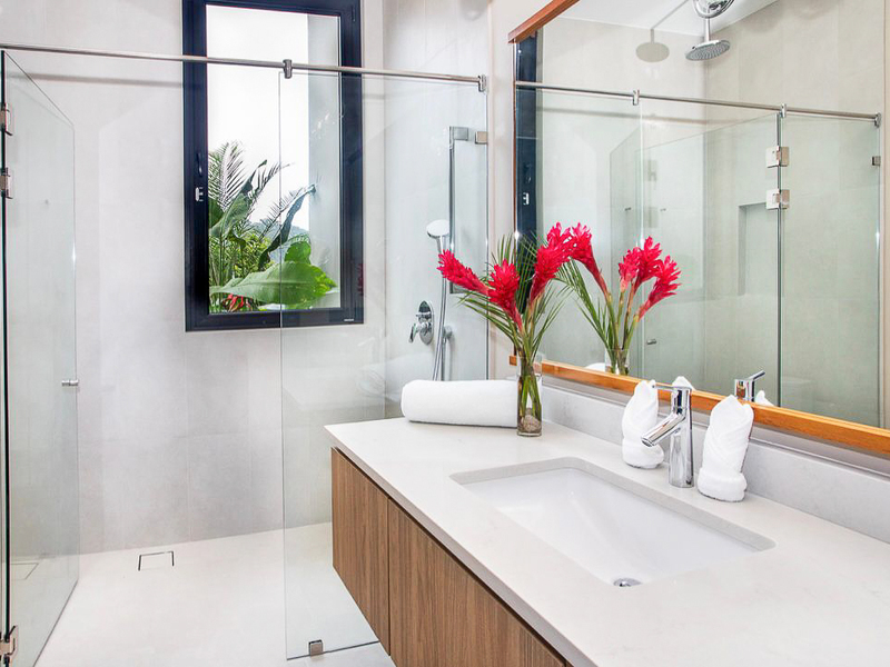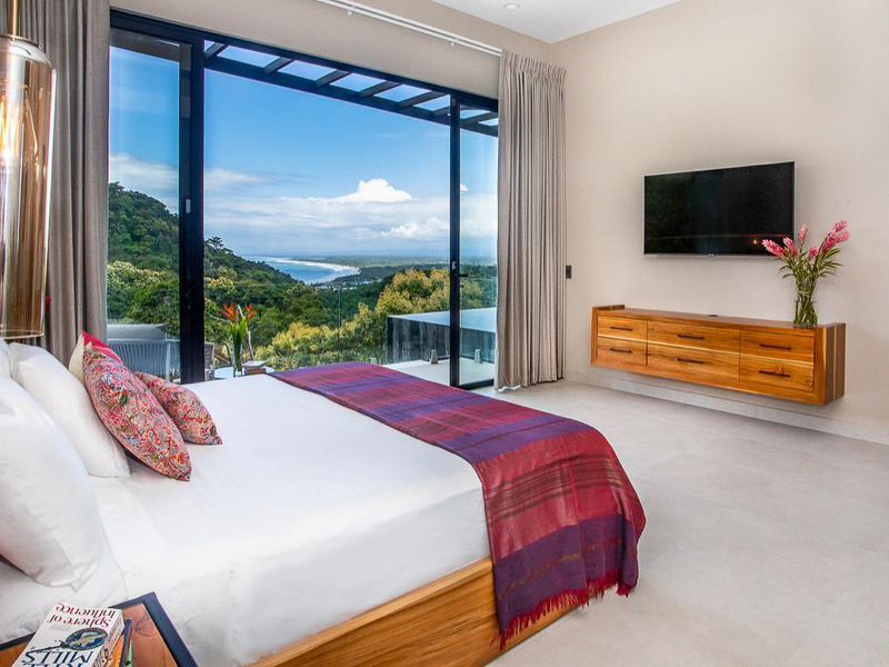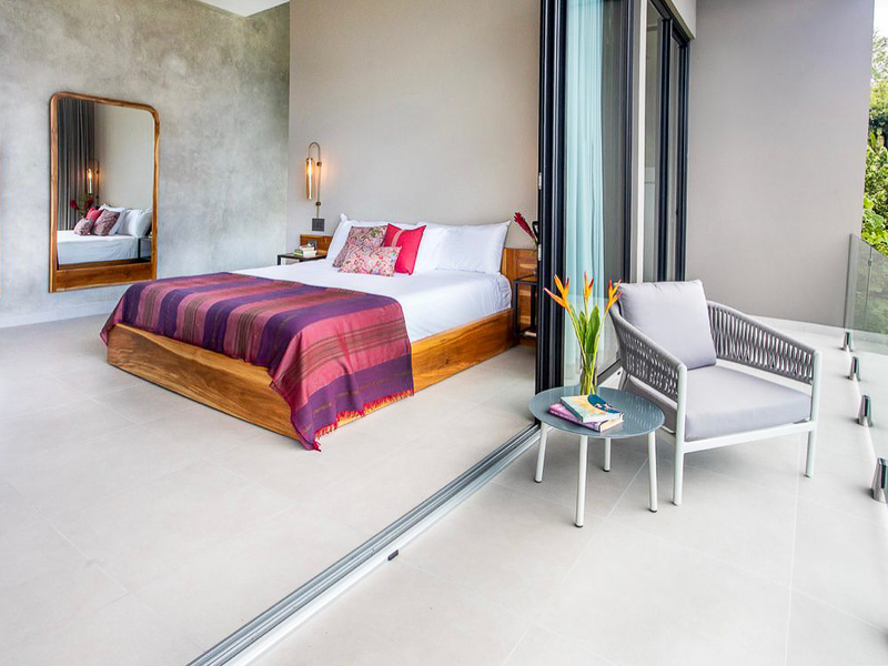 A short staircase leads to a versatile bonus room ideal for an inspiring home office, fitness area, or additional guest bedroom. The lower level hosts two spacious guest suites, each with its own terrace opening directly onto the landscaped gardens for an intimate connection with the surrounding jungle.