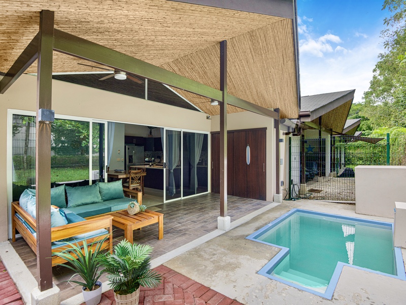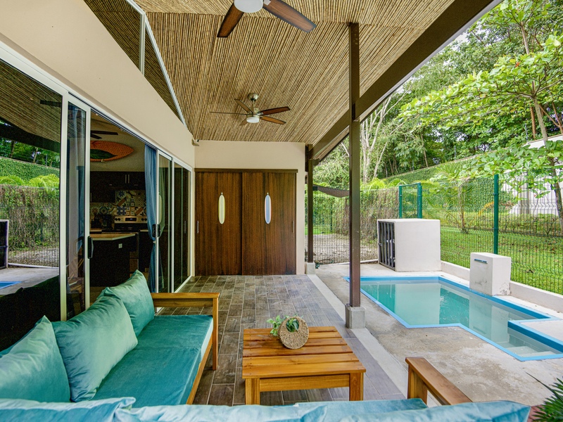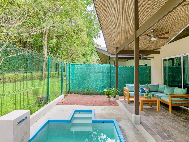 - Private Outdoor Retreat: Enjoy your own plunge pool, surrounded by custom teak patio furniture and a gated backyard for privacy.