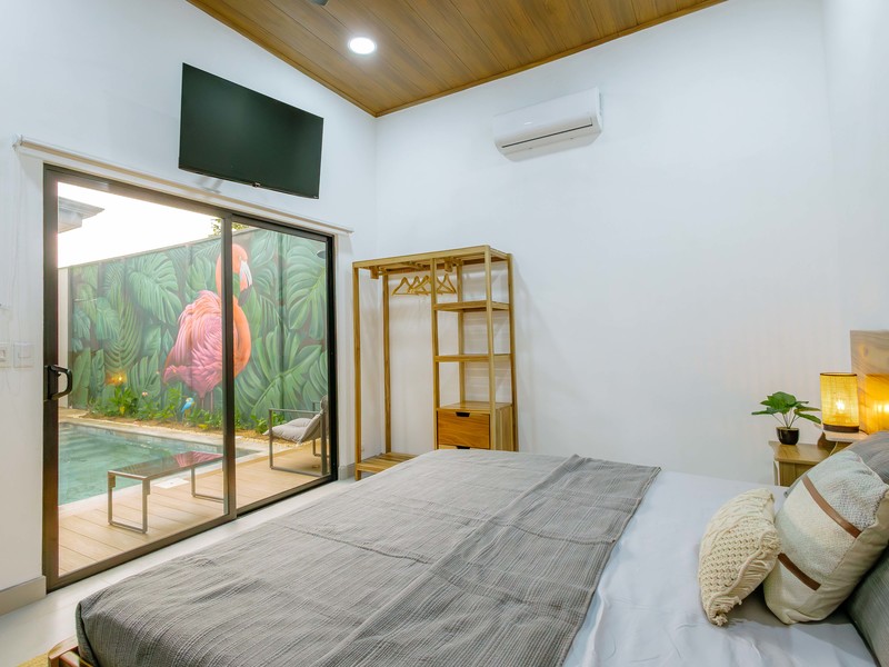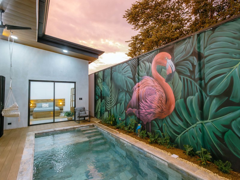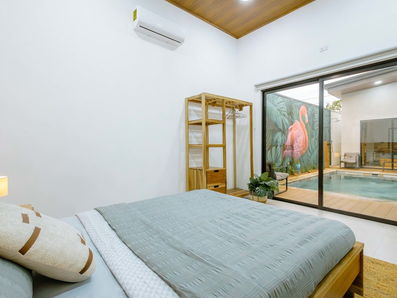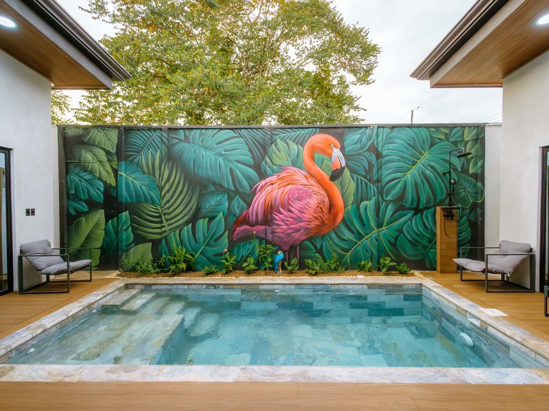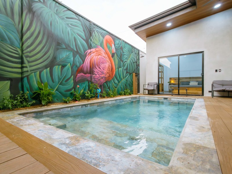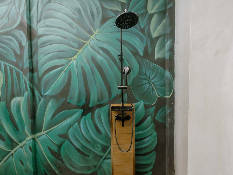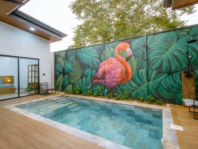 Inside, soaring ceilings and a full wall of bi-fold doors create a seamless indoor–outdoor flow, opening the entire living space onto a lush tropical terrace. The private pool with muti-level distribution is enhanced by a custom mural by a local artist, serves as the heart of the villa, with living areas and bedrooms thoughtfully arranged around it to provide calming water views throughout the home.