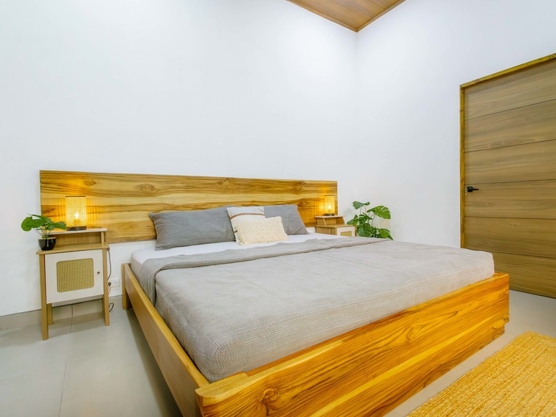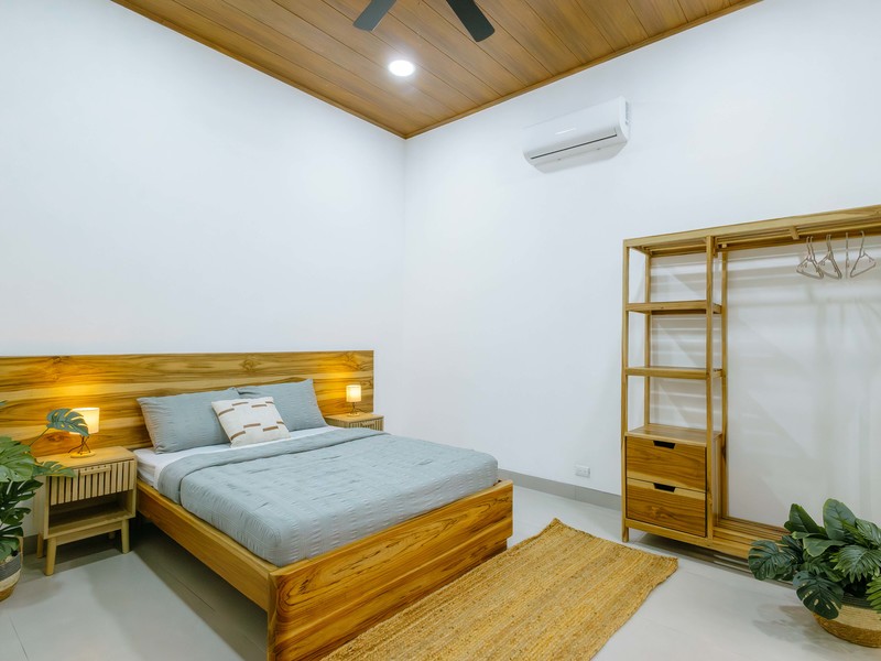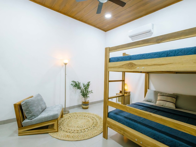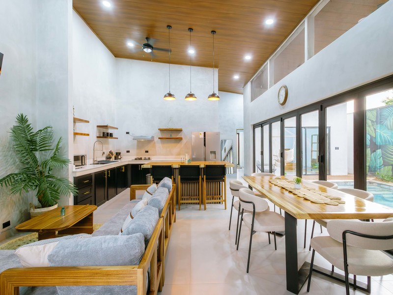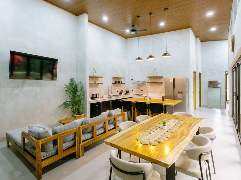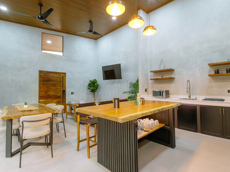 The spacious kitchen is perfect for entertaining, featuring white quartz countertops, a butcher-block island with built-in outlets, and ample prep and gathering space. Every piece of furniture in the villa has been custom crafted from local hardwoods, adding warmth, character, and authentic Costa Rican craftsmanship.