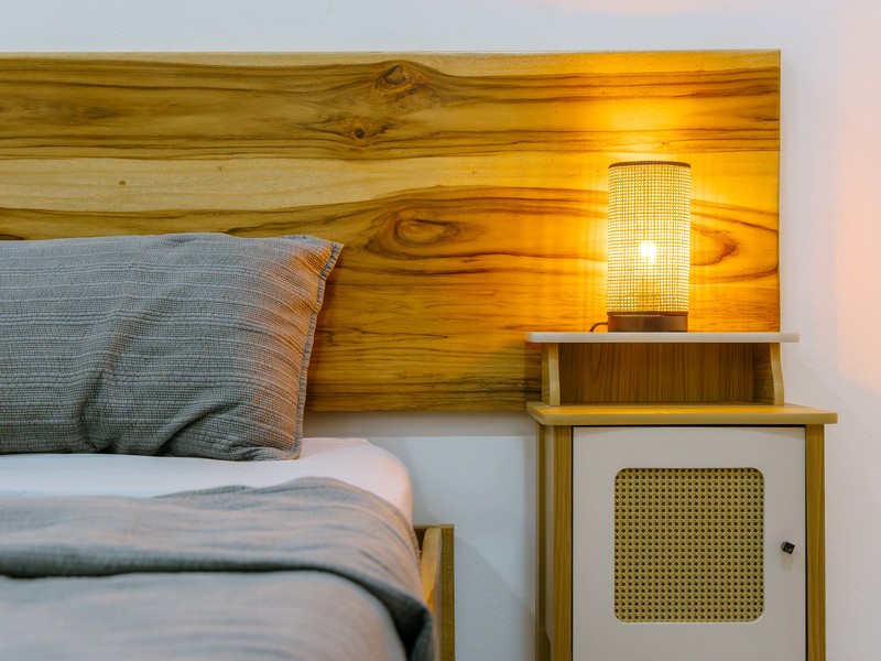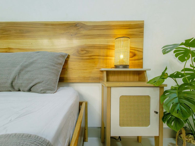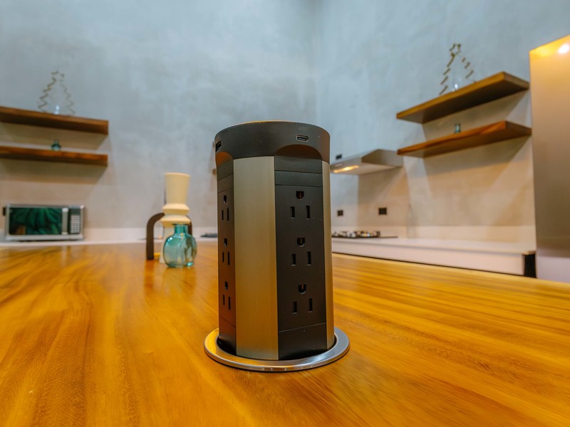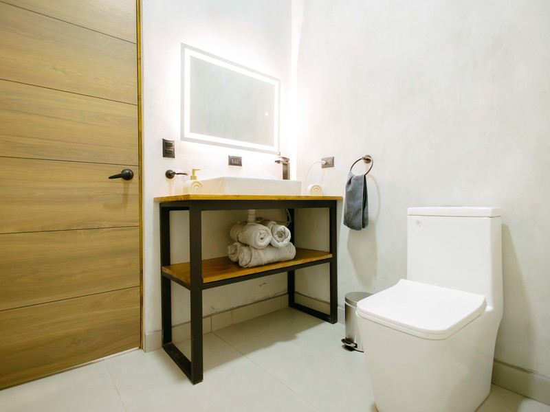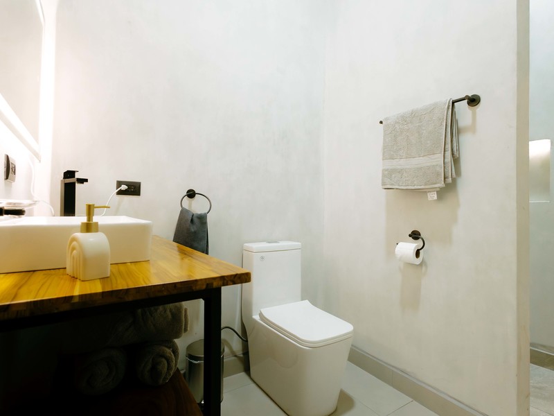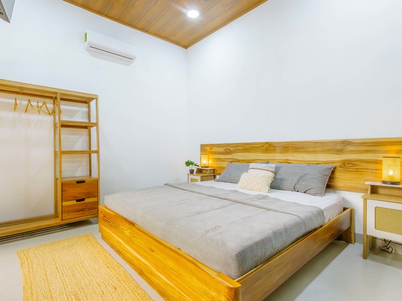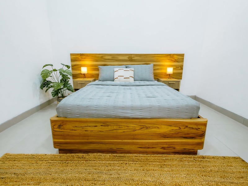 The spacious kitchen is perfect for entertaining, featuring white quartz countertops, a butcher-block island with built-in outlets, and ample prep and gathering space. Every piece of furniture in the villa has been custom crafted from local hardwoods, adding warmth, character, and authentic Costa Rican craftsmanship.