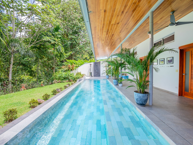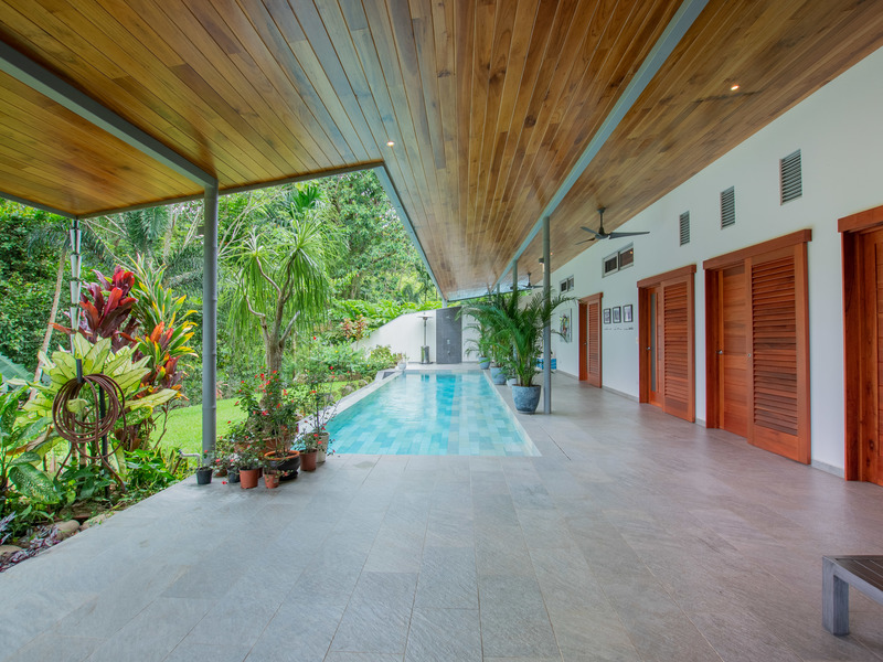 Outdoor living is a highlight, with wide covered corridors, a private swimming pool, and multiple seating areas overlooking the surrounding greenery.