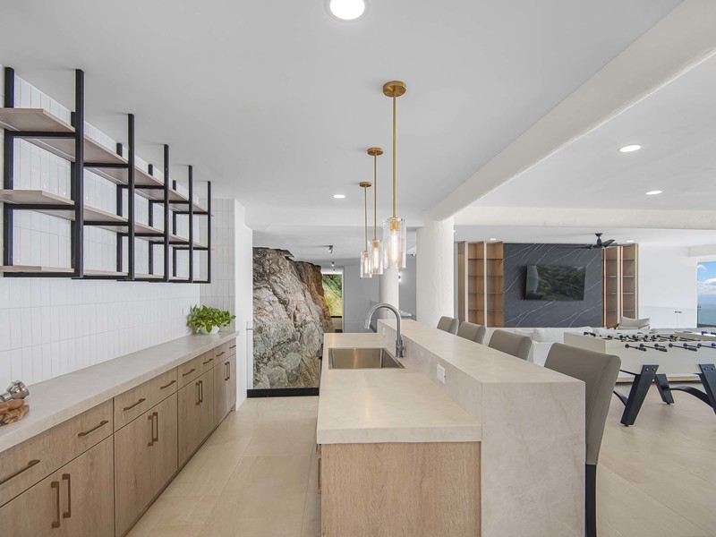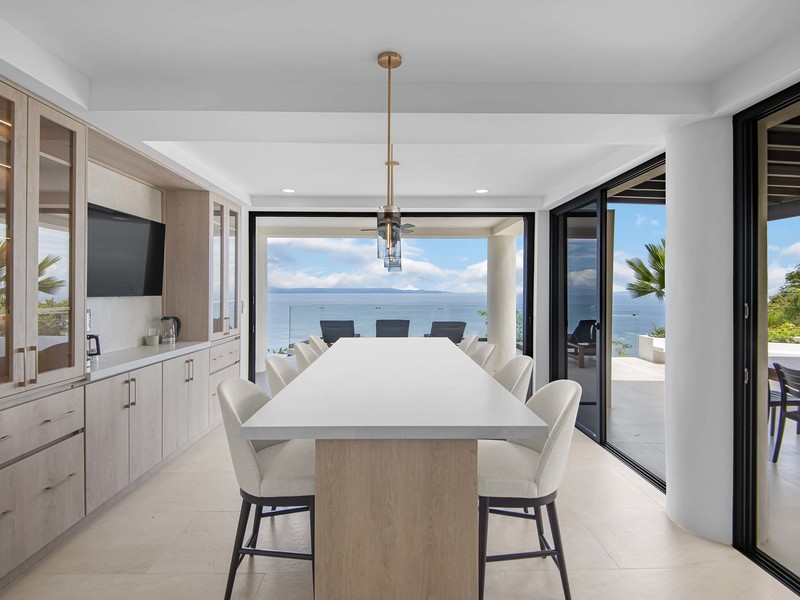 The gourmet kitchen includes an oversized quartz waterfall island, custom cabinetry, built-in storage, and seamless indoor-outdoor dining opening directly to the pool terrace.