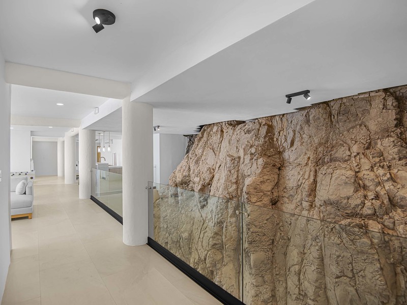 The main living space is centered around a dramatic great room with retractable glass walls, custom wood cabinetry, curated lighting, and a striking natural stone feature wall carved directly from the hillside. Every material selection reflects the 2025 redesign.