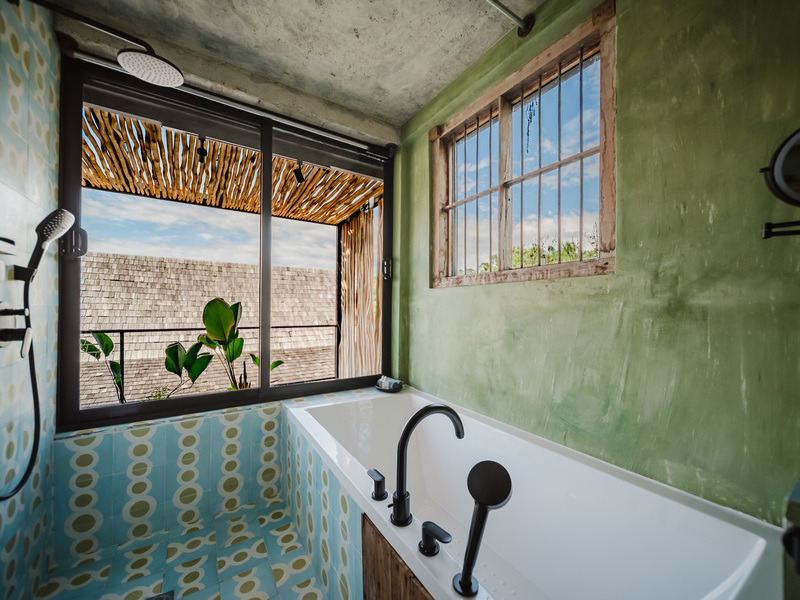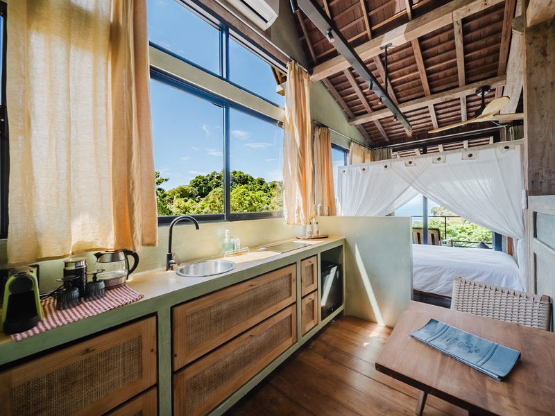 2 wooden villas, each with a small kitchenette, spacious bathroom featuring bathtub and shower, double sinks, and separate private toilet