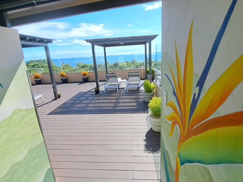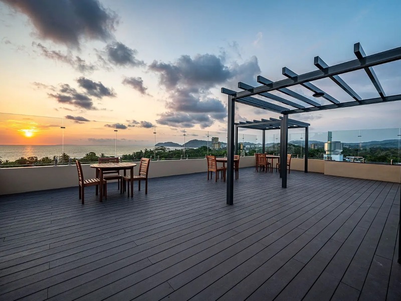 Take the elevator to the rooftop lounge and enjoy panoramic views of the Pacific Ocean, surrounding mountains, and the town of Jacó, along with unforgettable sunsets.