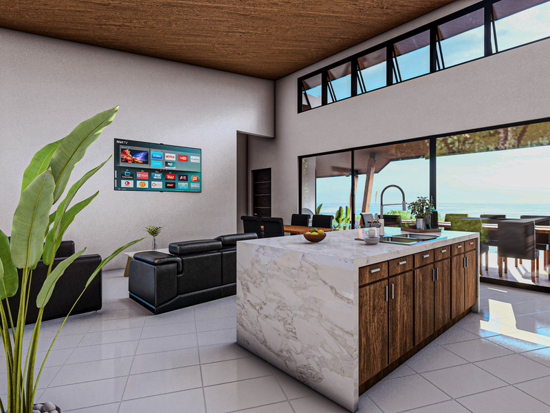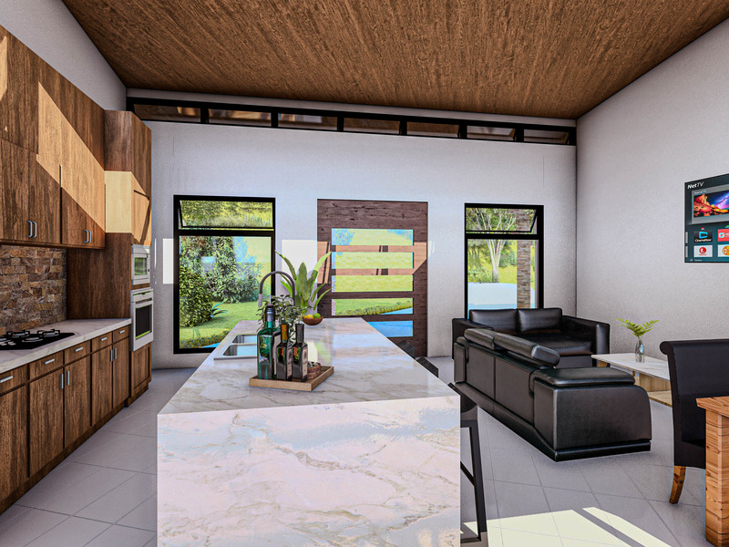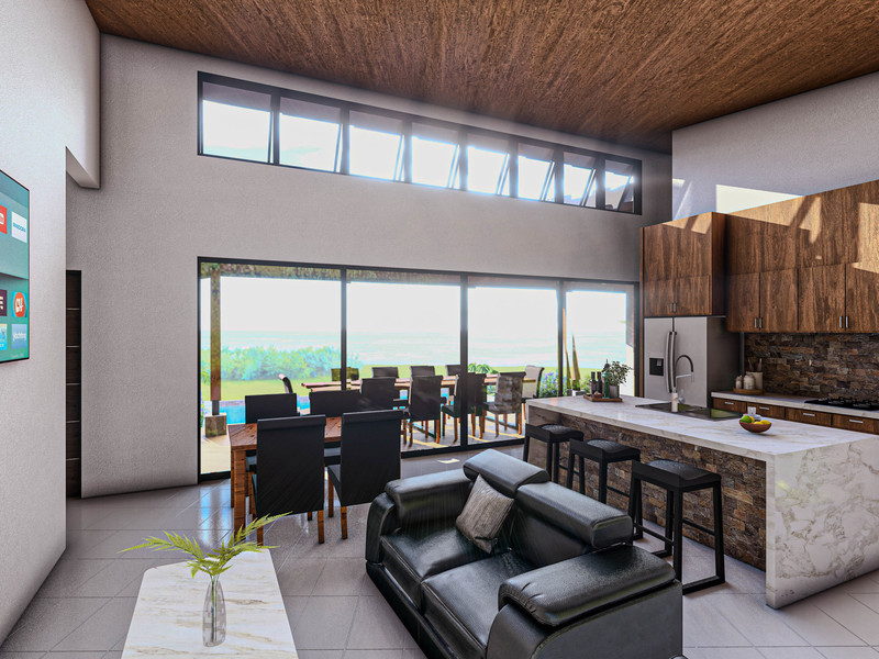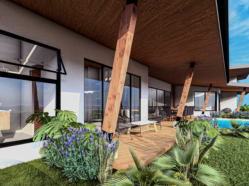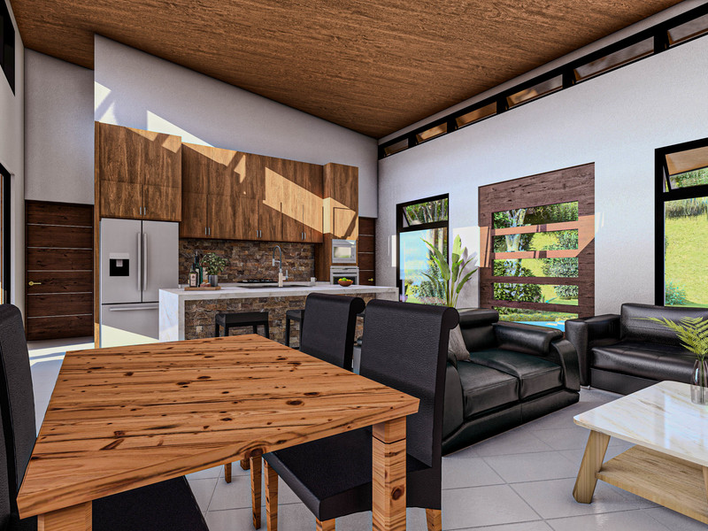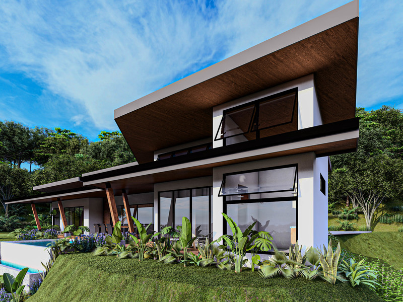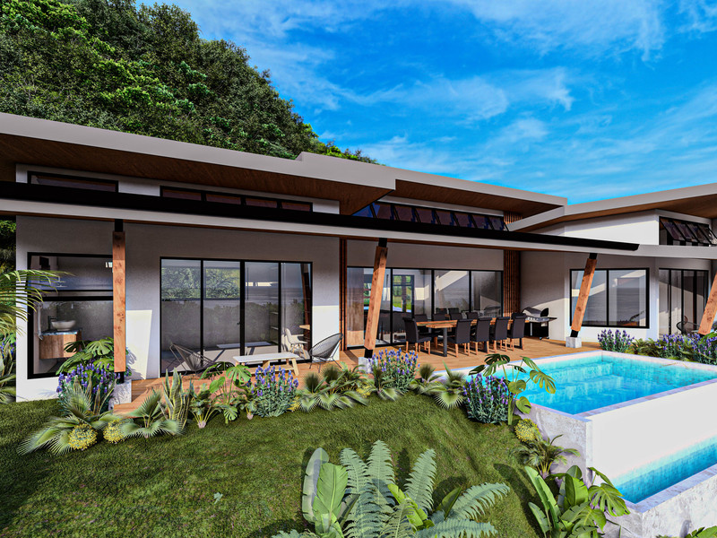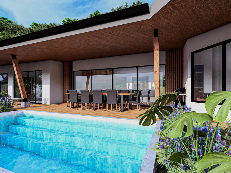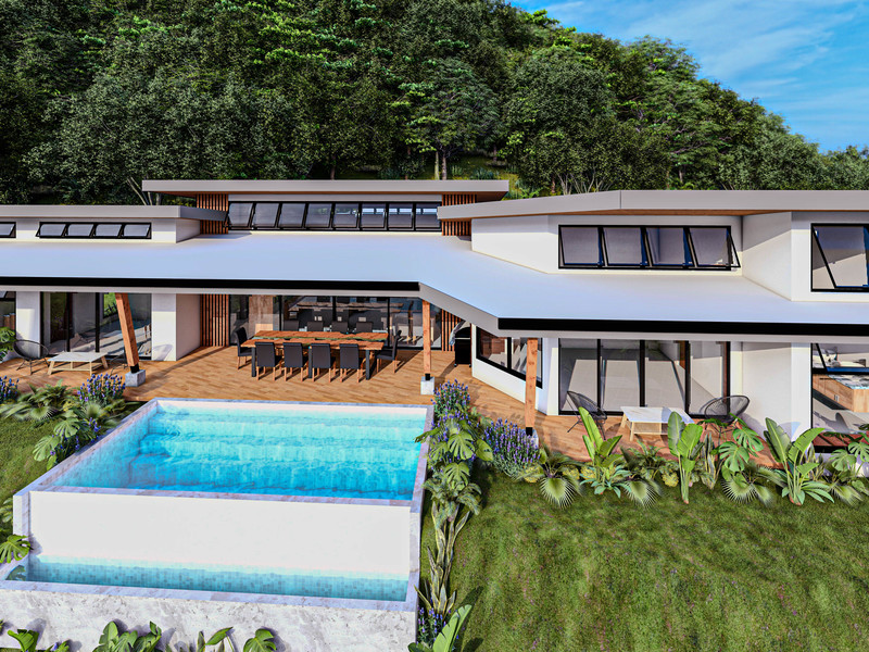The modern tropical design, included, was created specifically for this property and embraces the indoor-outdoor lifestyle that defines luxury living in the Southern Pacific region. The total build area is 241.37 m², including 138.49 m² of interior living space complemented by a generous covered terrace, pool area, parking, and additional outdoor elements designed to blend seamlessly with the natural surroundings. Clean architectural lines, expansive glass walls, deep overhangs, and warm wood accents create a contemporary yet tropical aesthetic. The open-concept living and dining areas flow directly onto the terrace and infinity-style pool, creating a natural extension of the home where sunsets, entertaining, and everyday living come together effortlessly.