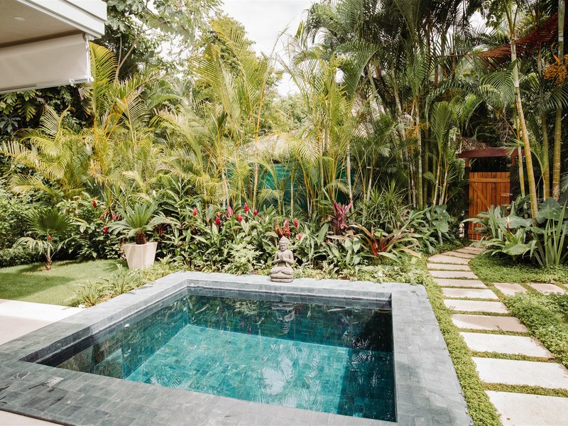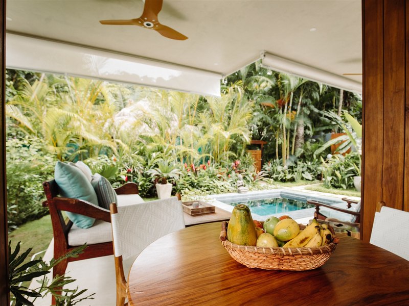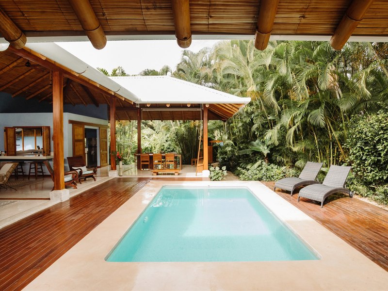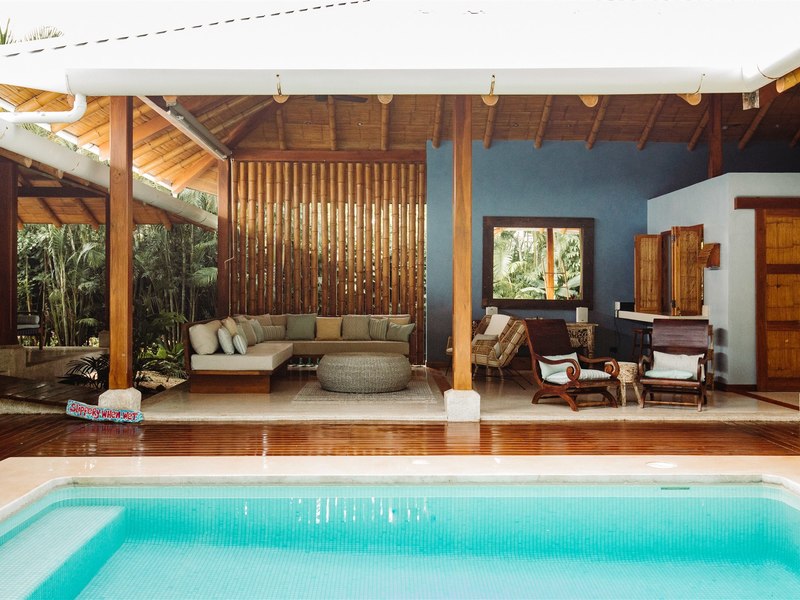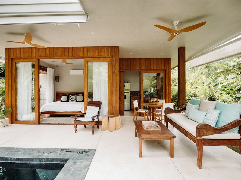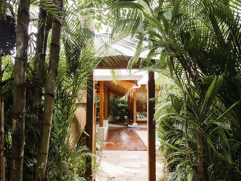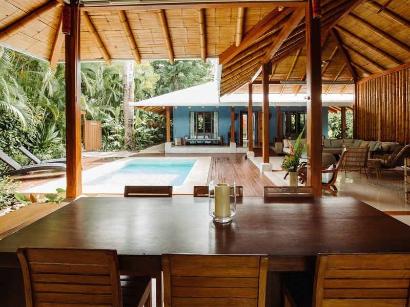 The main home is thoughtfully designed to maximize natural light and airflow, creating a seamless connection between interior spaces and the surrounding jungle.