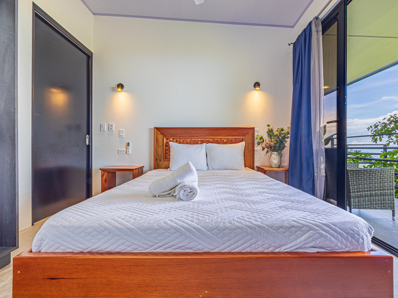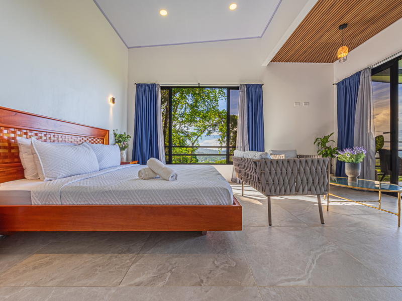 Primary bedroom: a private and spacious retreat with direct ocean views, a king-size bed, an ensuite bathroom with carefully selected tiles, a tempered glass shower — perfect for enjoying a relaxing hot shower while taking in the views.