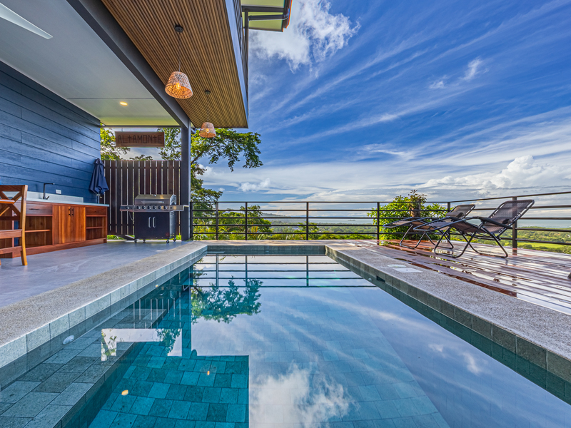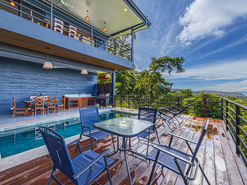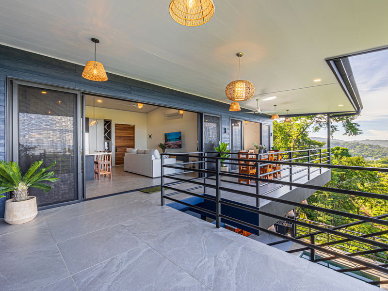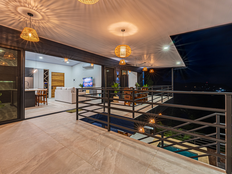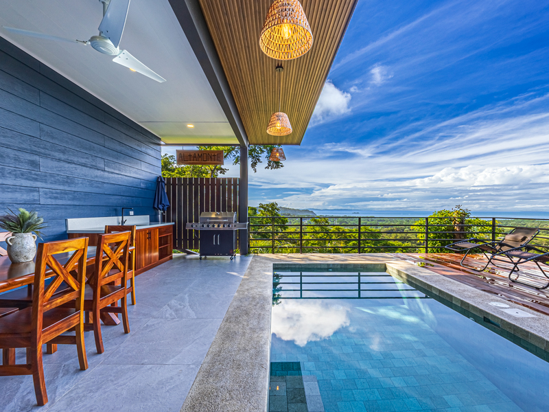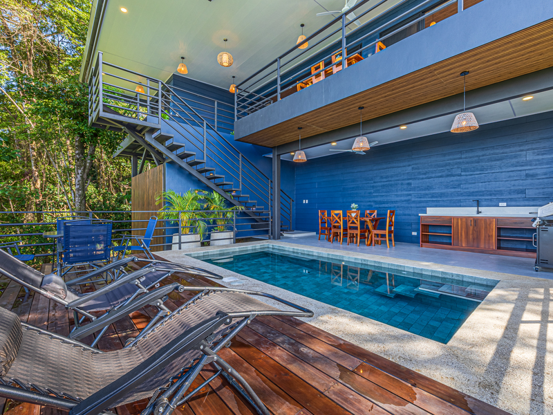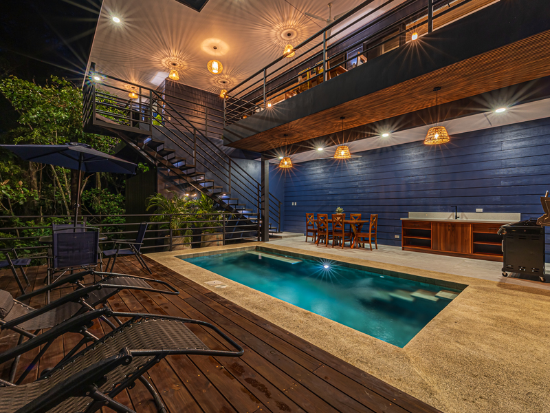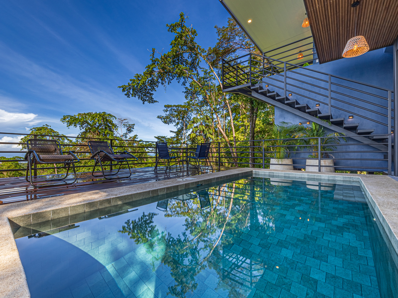 The pool area is a private and serene space, surrounded by lush jungle complemented by a generous terrace that invites relaxation, sunbathing, and watching the golden sunsets over the Pacific.