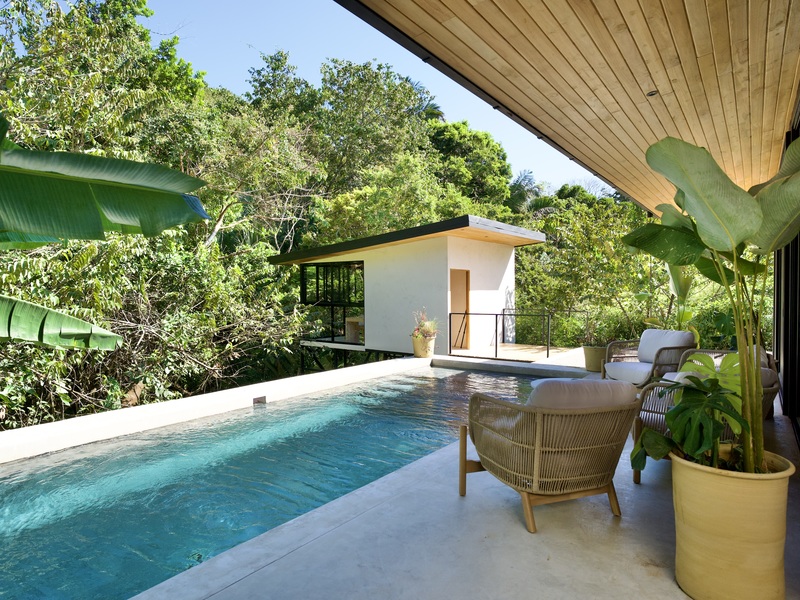 Step outside to your private swimming pool, perfect for cooling off after a day at the beach or enjoying tranquil afternoons surrounded by lush greenery.