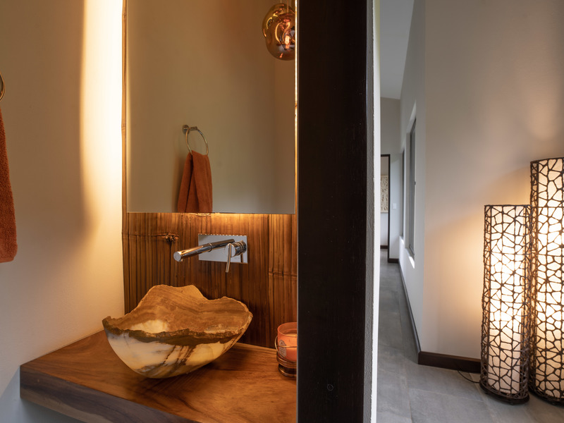 • Stunning large teak root slab wall decorations, Imported Bali headboard (master), Bali stone carving wall hanging, custom laser designed screen covers and wall decorations