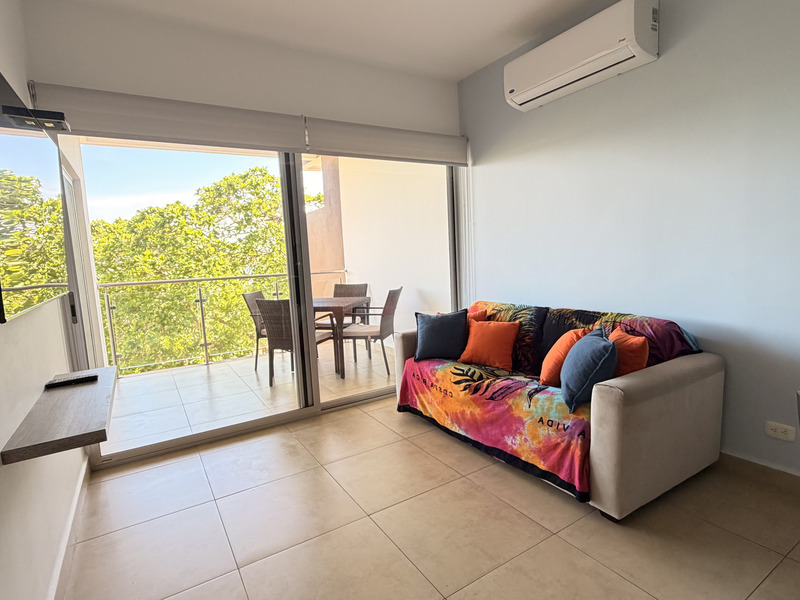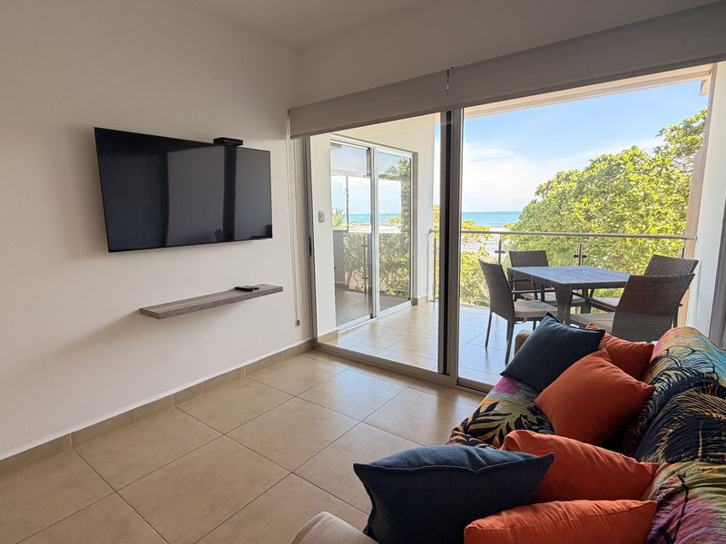 Este condominio de 2 habitaciones y 2 baños cuenta con un diseño abierto, iluminado con luz natural y brisa fresca del mar. La sala se conecta con un balcón privado ideal para relajarse y disfrutar de la vista.
