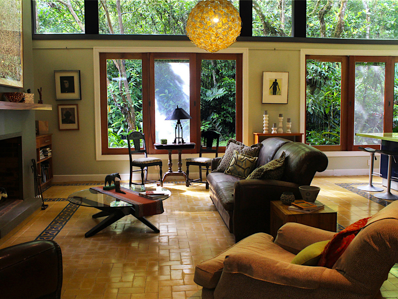 The main house and studio are currently being used as a live-in and workspace for their residential artists. It includes around 2400 square feet of indoor space and could be renovated into four more bedrooms and bathrooms. The studio features moveable walls for flexibility, allowing better lighting for artists or to add more rooms, or even make it your private residence. The studio currently features a large green wooden island ideal for entertaining. The living room includes a casual and comfortable style, complete with brown leather couches, strobe lighting, and a fireplace to keep warm during the cool nights. It also includes a lounge area with comfortable love seats, where guests can read or converse amongst each other. The master suite includes a king bed, floor to ceiling windows, and a glass-enclosed shower, as well as a private terrace. The exterior of it features a butterfly roof, which lets natural lighting in and circulating air. With the mild temperatures, you won\'t have to pay for air conditioning.